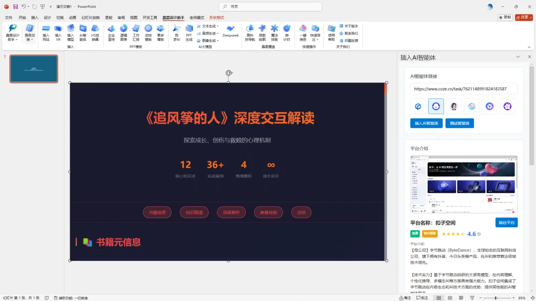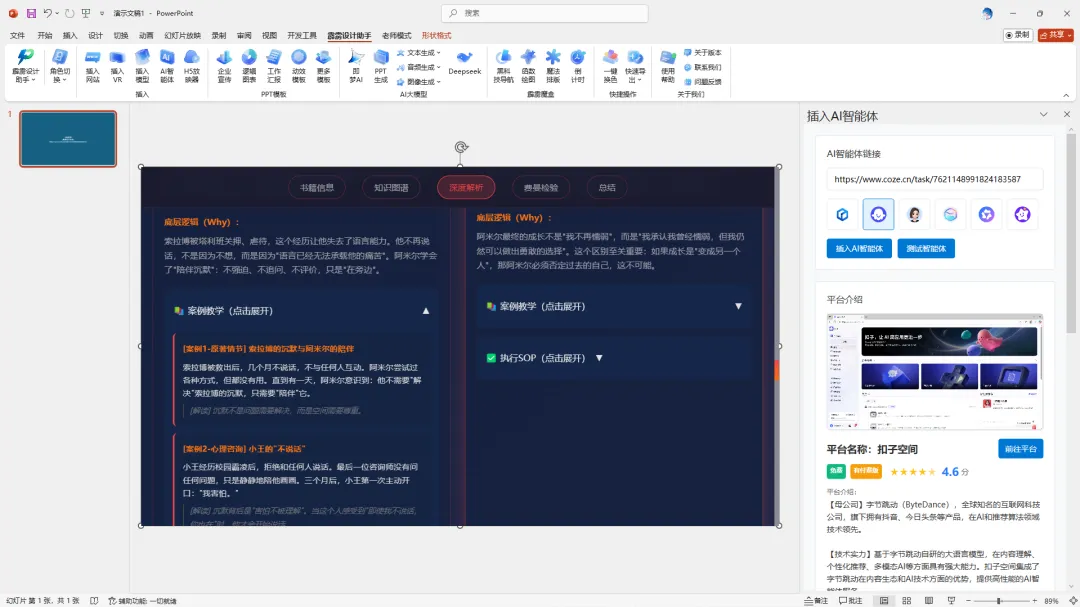 要让 PPT 识别到扣子空间 AI,必须先拿到它的专属直链。这里重点教大家如何在扣子商城找到合适的智能体,并以说课场景常用的 “快速榨干一本书” 为例找对智能体:3 步筛选适配工具打开扣子空间官网(https://coze.cn/),登录后点击顶部「模板商城」(扣子的智能体集市,涵盖教育、办公、营销等场景,所有模板支持一键复制使用);在搜索框输入关键词 “说课”“教案”“书籍总结”,或直接在左侧分类栏选择「教育教学」,即可筛选相关智能体;以 “快速榨干一本书” 为例:这款智能体的核心功能是 “输入书籍名称 / 核心观点,1 分钟生成思维导图、重点摘要、案例延伸”,完美适配说课场景 —— 比如教师准备 “《给教师的建议》说课课件”,可通过它快速提炼书籍核心观点,还能实时回应评委关于书籍细节的提问。获取直链:一键复制 + 测试点击 “快速榨干一本书” 智能体的「复制模板」按钮,跳转至智能体编辑页(无需修改任何设置,直接使用默认配置即可);点击右上角「分享」,选择 “生成交互直链”,系统会自动生成以 https:// 开头的链接(格式类似https://coze.cn/bot/xxxxxxx);复制链接后,务必在浏览器打开测试,链接有效(扣子分享链接默认长期有效,无需频繁刷新)。(二)把链接插入 PPT,生成 AI 交互窗口(说课场景实操)回到 PPT 的说课课件(比如 “《分数的初步认识》说课 PPT”),在核心环节页面(如 “教学理念依据”“教材分析”)的侧边栏输入复制的 “快速榨干一本书” 直链;