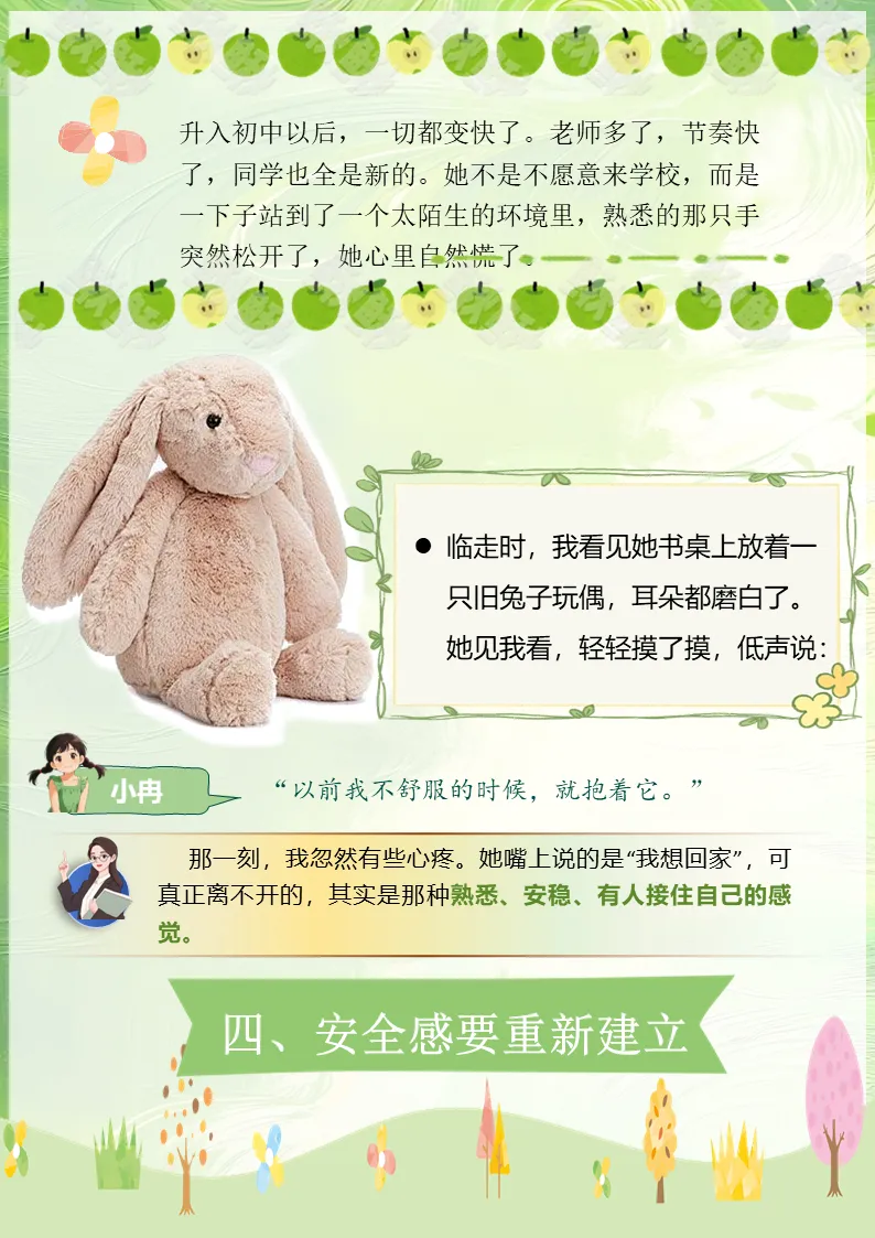 临走时,我看见她书桌上放着一只旧兔子玩偶,耳朵都磨白了。她见我看,轻轻摸了摸,低声说。那一刻我明白,她要的不是解决问题,而是一个能让她感到安全的小角落。
