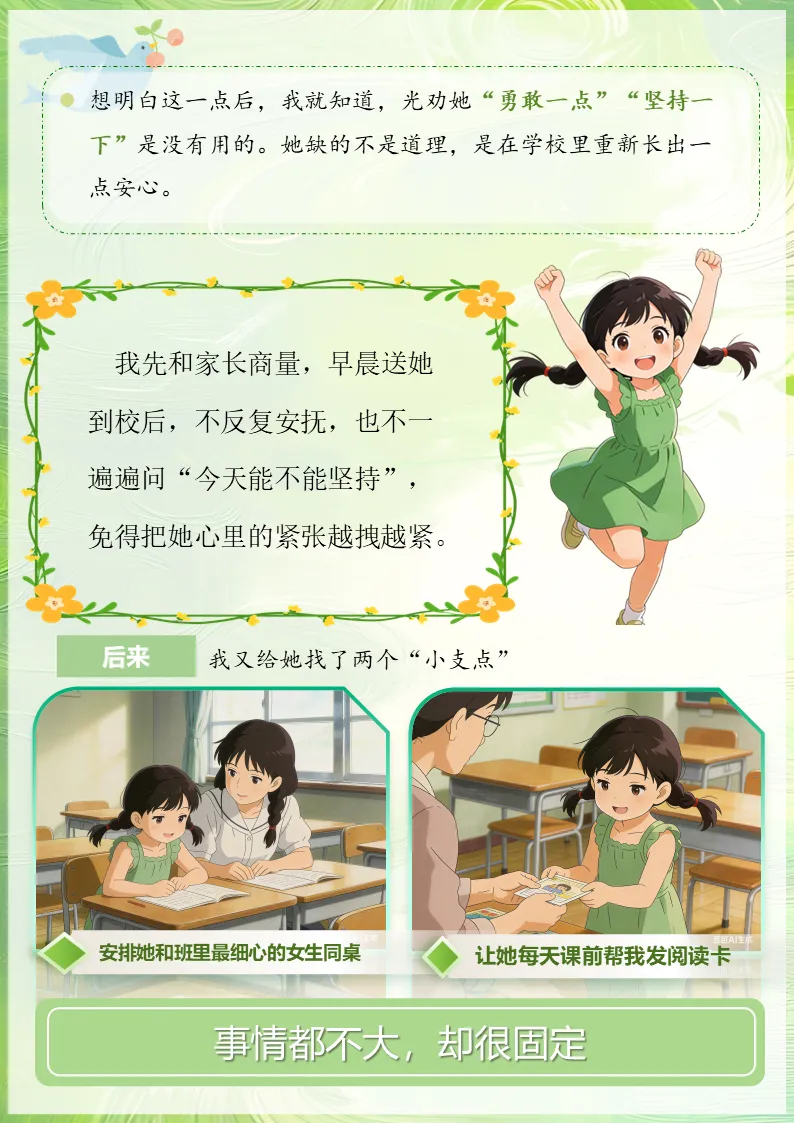 我先和家长商量,早晨送她到校后,不反复安抚,也不一遍遍问“今天能不能坚持”,免得把她心里的紧张越拽越紧。