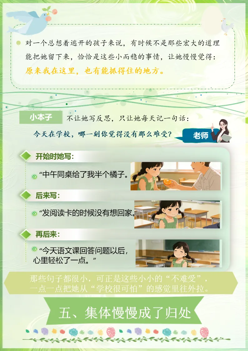 开始时她写:“中午同桌给了我半个橘子。”后来写:“发阅读卡的时候没有想回家。”再后来:“今天语文课回答问题以后,心里轻松了一点。”那些句子都很小,可正是这些小小的“不难受”,一点一点把她从“学校很可怕”的感觉里往外拉。