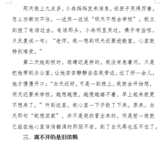 直到有一天晚上,我接到她妈妈的电话,说小冉在家哭了很久。电话那头,小冉明显哭过,嗓子有些哑,只反复说一句。第二天她到校时,眼睛还是肿的。我没有急着问,只是把她带到办公室,让她安安静静坐在我旁边。过了好一会儿,她才慢慢开口。