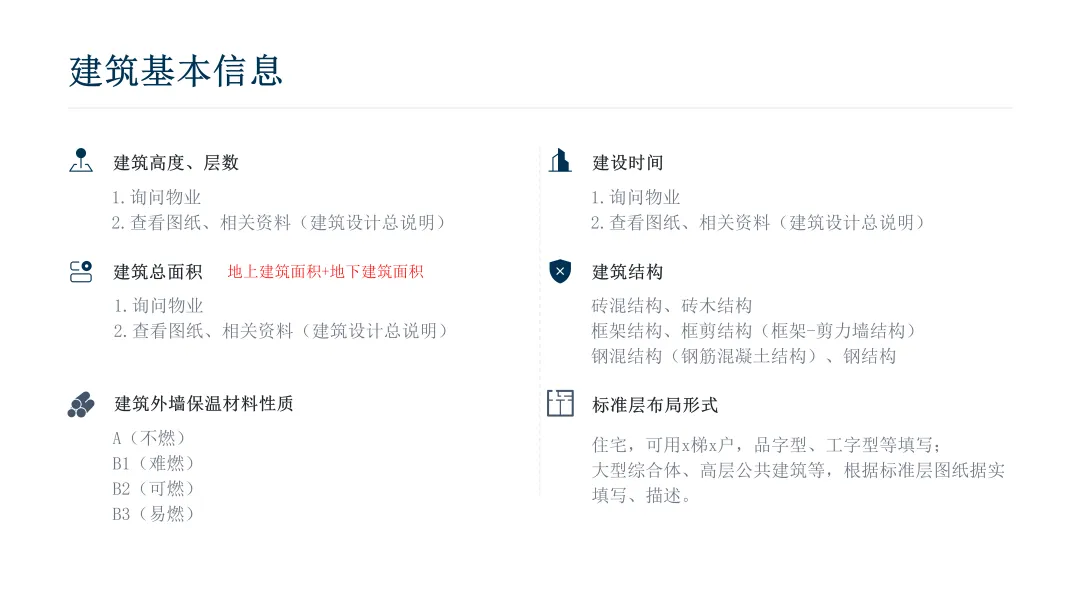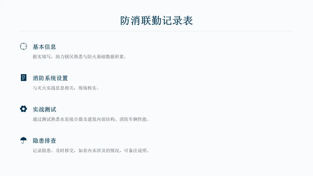 主旨内容:该课件围绕防消联勤工作展开,指导规范填写联勤记录表,涵盖建筑基本信息采集、消防系统现场核实、实战测试熟悉设施性能及隐患排查移交等内容。详细讲解建筑消防关键要素:疏散楼梯的四种类型及适用场景,消防电梯的强制设置范围与技术要求,避难层的设置标准与功能区别,灭火救援窗、消防车登高作业场地的配置规范。同时介绍消防通道、室内外消火栓、消防水箱、水泵接合器等设施的功能、设置要求及操作要点,明确消防控制室的位置及需保存的核心管理资料,助力提升防火基础数据积累与灭火实战能力。