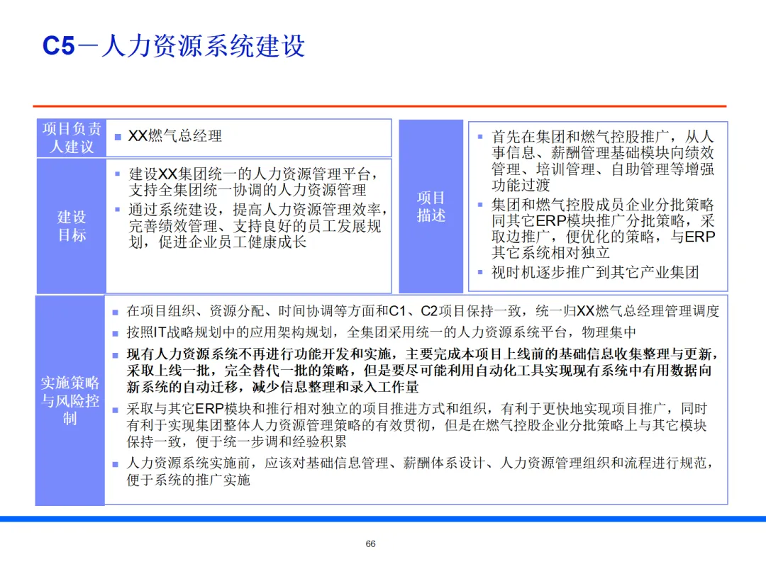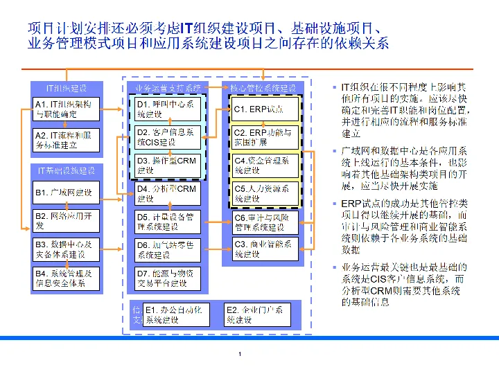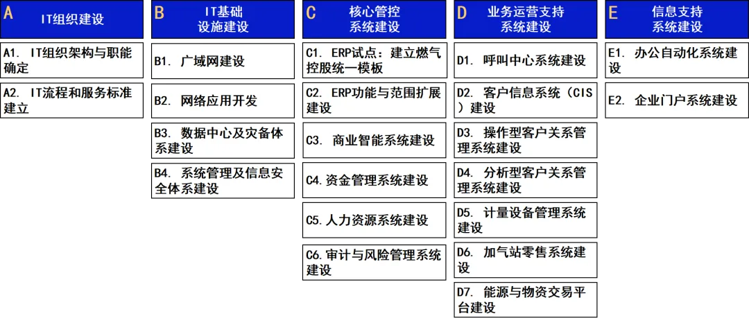 规划覆盖IT 组织、基础设施、核心管控、业务运营、信息支持五大领域,形成闭环信息化体系。