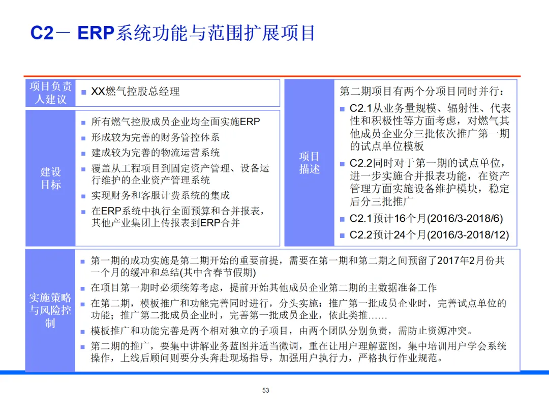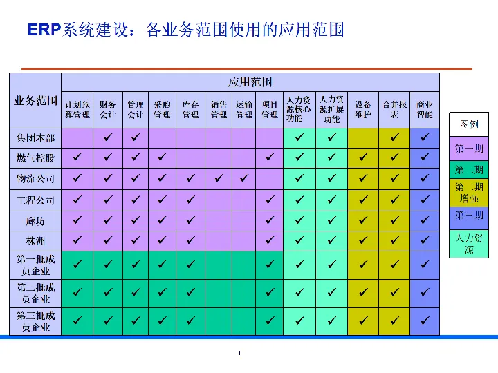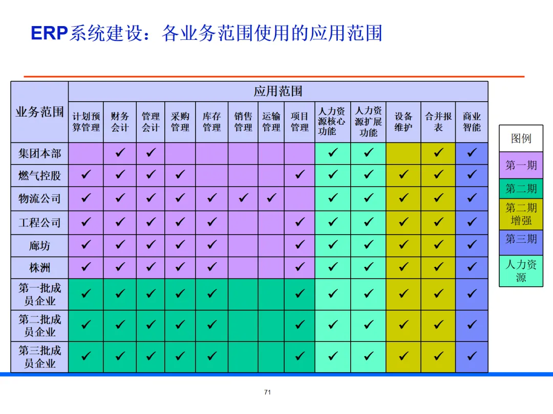 以ERP 为核心先行试点,打造统一模板,覆盖财务、采购、库存、项目管理等关键能力,分批全集团推广。