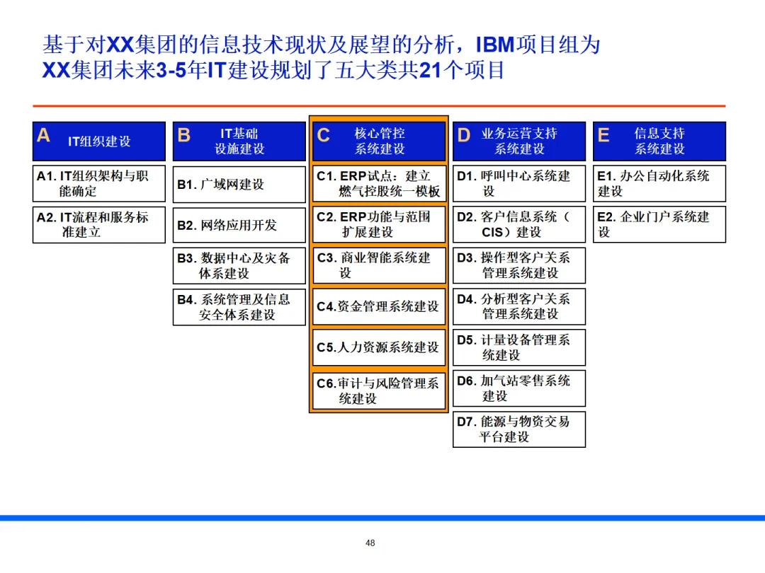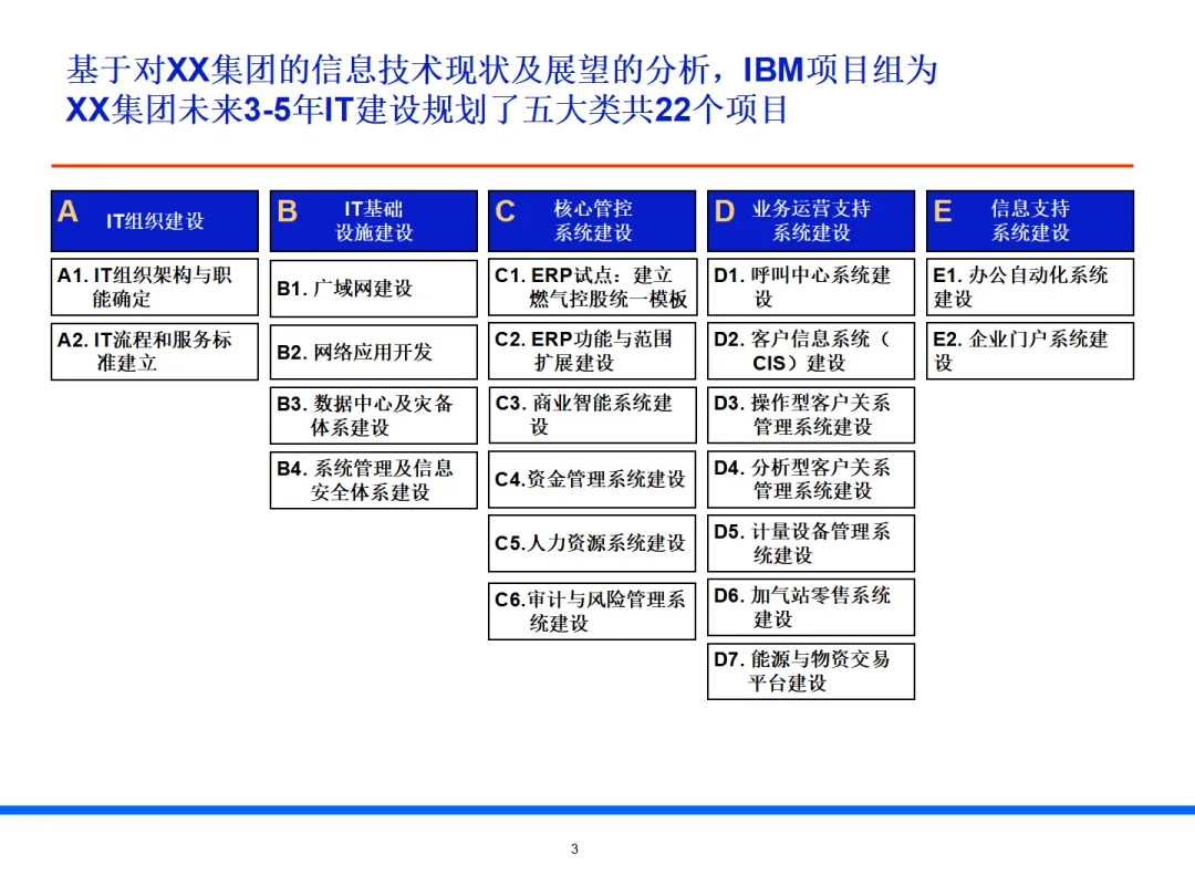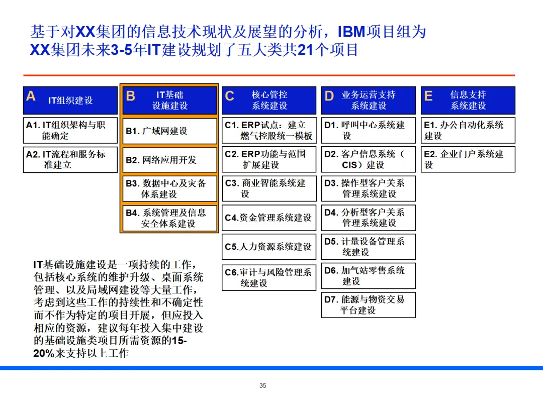 本文档是 IBM 为大型集团量身打造的流程优化与 3–5 年 IT 规划实施计划报告,围绕信息化总体策略、IT 组织与基建、核心管控与业务运营系统、项目落地保障四大板块,形成一套可直接落地的数字化建设路线图。