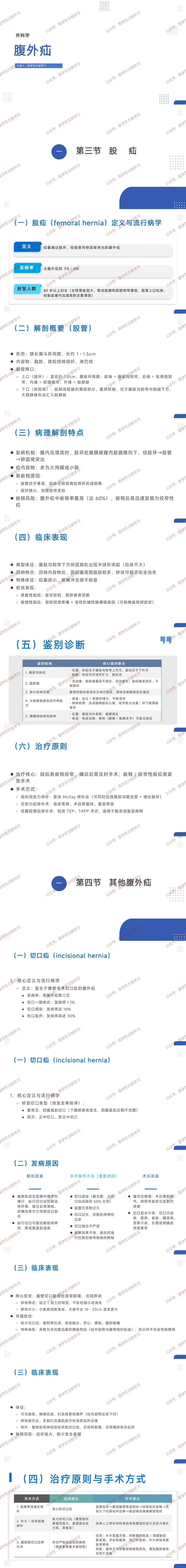 - 临床表现:腹股沟韧带下方卵圆窝处半球形突起(疝块不大),回纳后肿块可能不完全消失,咳嗽冲击感不明显;易复性症状轻(肥胖者易忽略),嵌顿后出现局部疼痛 + 急性机械性肠梗阻表现。