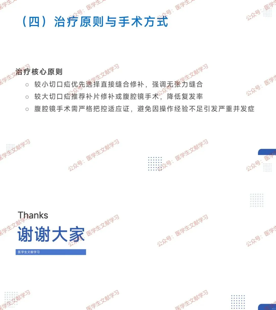 - 治疗原则:较小疝首选直接缝合修补(无张力),较大疝推荐补片修补或腹腔镜手术(降低复发率)。