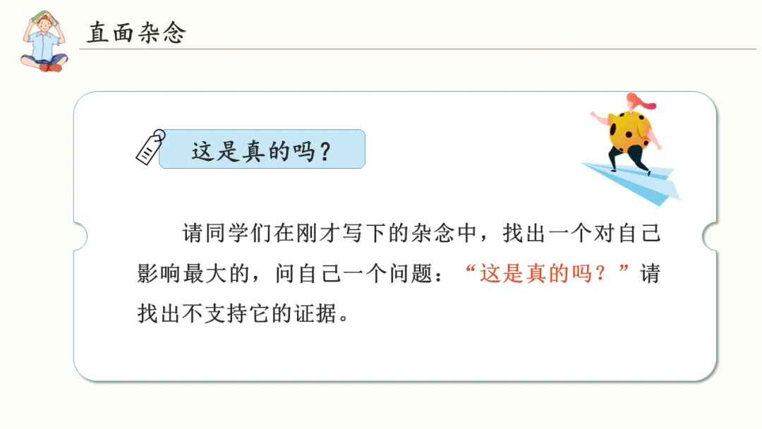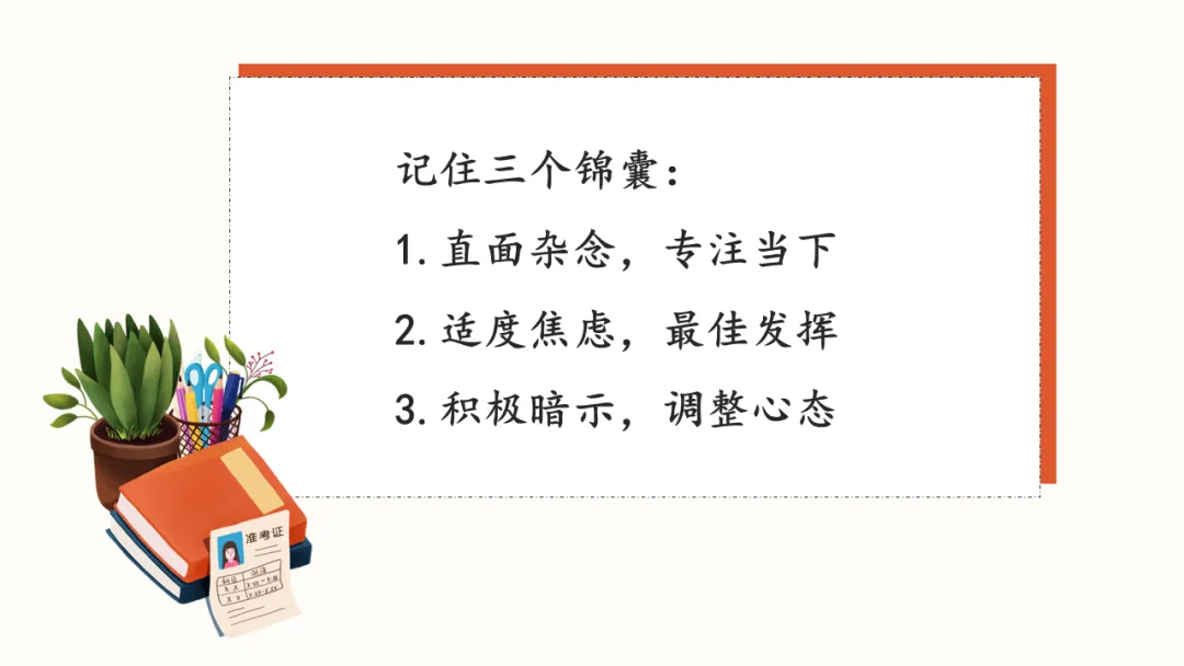 所以我想请大家先花一分钟时间,想一想:你现在脑子里最常出现的“杂念”是什么?是“我怕考不好”,还是“我万一发挥失常”?请你把它写下来。然后问自己一句:“这是真的吗?”试着去找找不支持这个想法的证据。