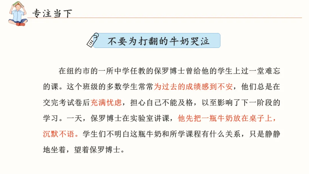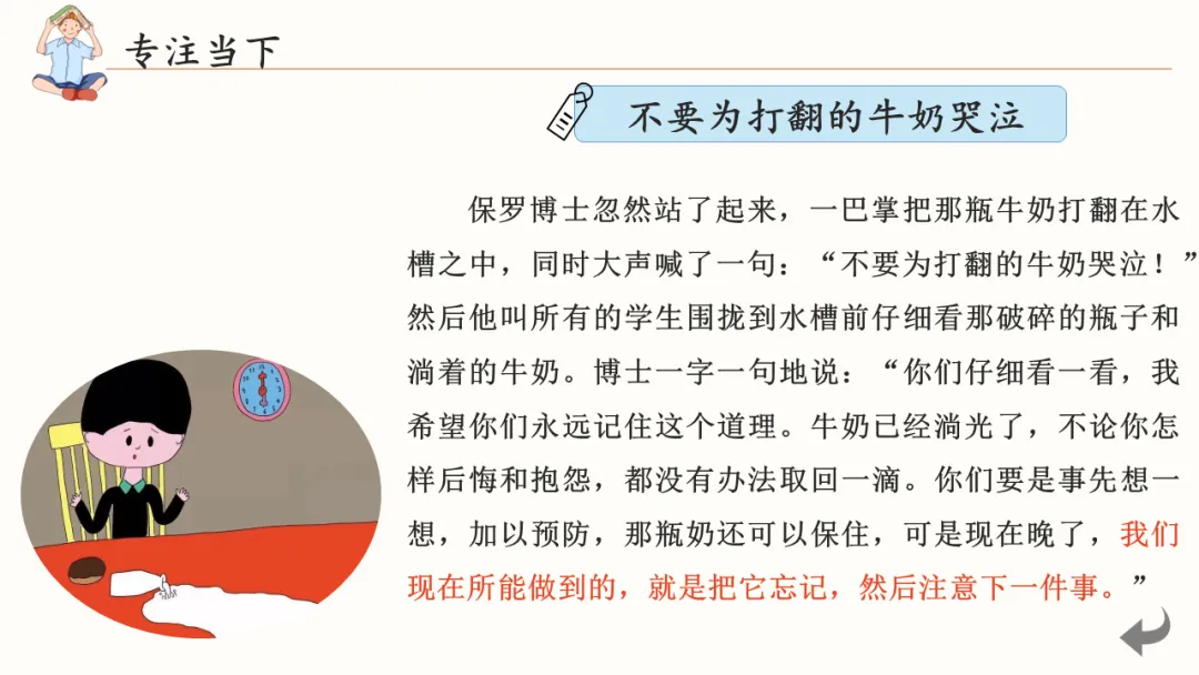 就像保罗博士在课堂上打翻牛奶的故事一样——牛奶已经洒了,再哭也没有用。我们能做的,就是把它忘记,专注下一件事。过去已成定局,但未来,还在你手中。