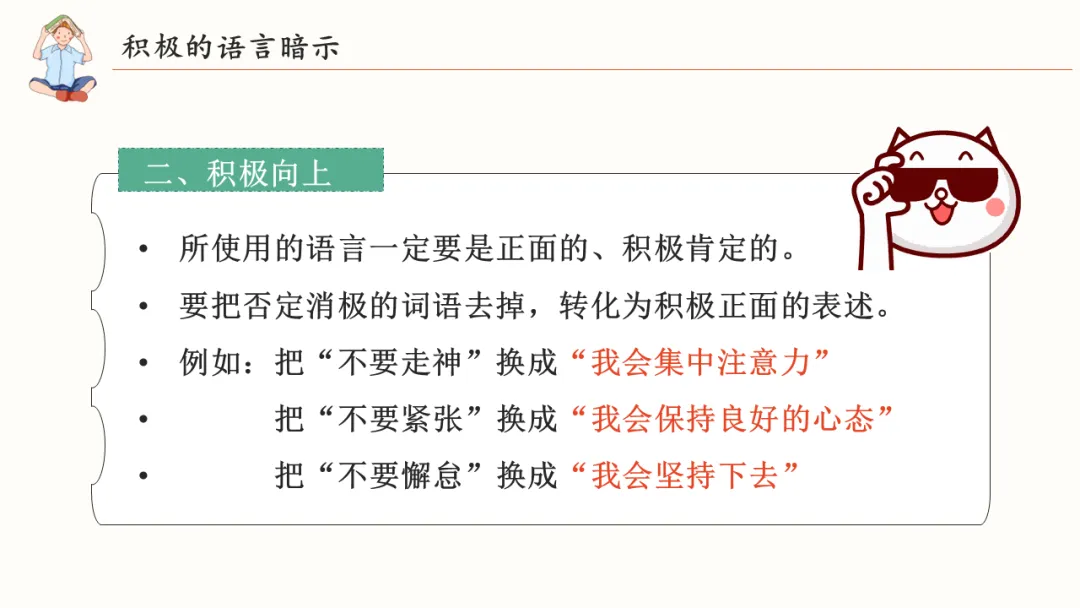 比如,把“不要走神”换成“我会集中注意力”;把“不要懈怠”换成“我会坚持下去”。语言要简单有力、积极向上,关键是——你要相信它。