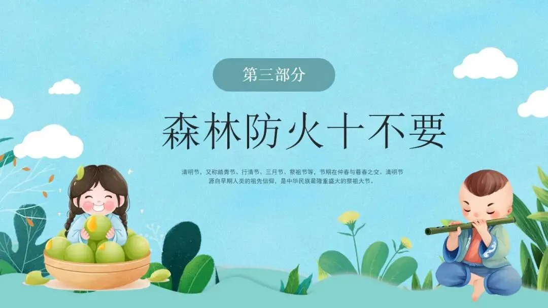森林是地球的肺,是万物的家园。一场大火,不仅烧毁的是成片的林木,更是无数小动物的家园,会破坏生态平衡,造成不可挽回的损失。因此,清明防火,人人有责!请牢记森林防火 “十不要”:不要携带火种进山,不要在林区吸烟、野炊、烧烤,不要上坟烧纸、燃放烟花爆竹…… 这些看似微小的举动,都可能成为火灾的导火索。