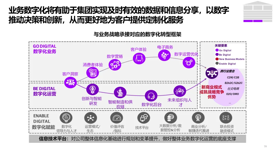 5. 敏捷组织与人才赋能 | 构建与数字化业务匹配的组织与人才体系。 | 1. 推动“业务+IT”的融合型跨职能团队建设。2. 实施数字化技能“全员提升计划”,重点培养产品经理、数据科学家等新角色。3. 引入敏捷工作方法,加速创新试错与迭代。 |