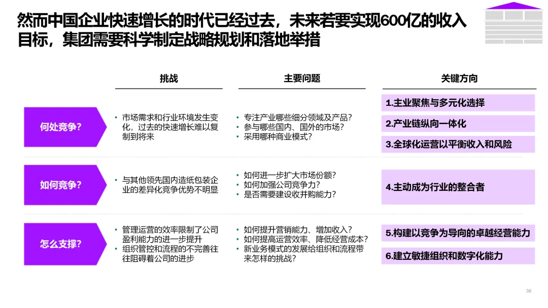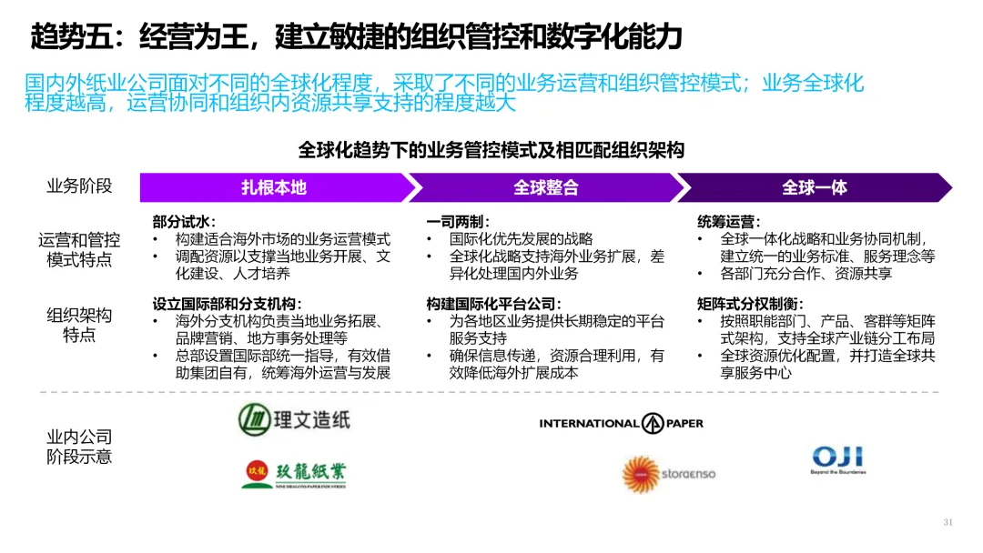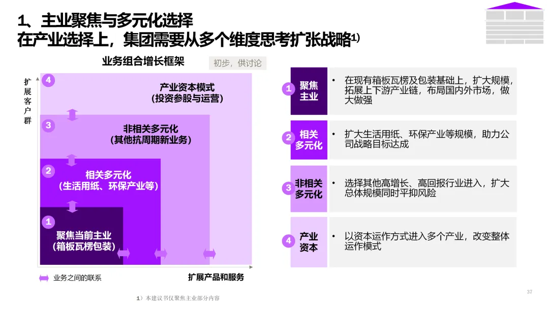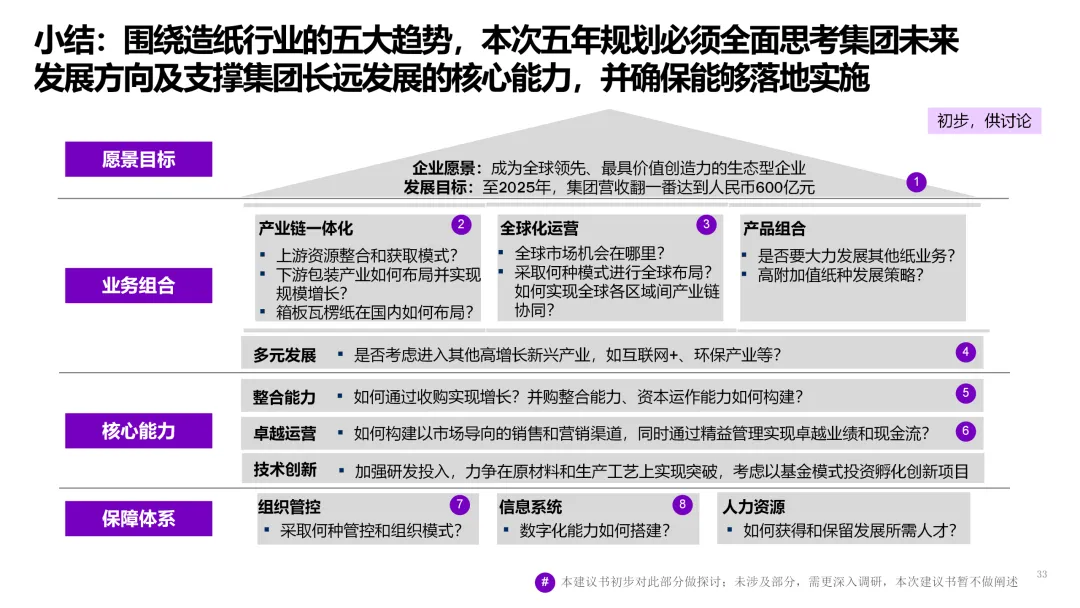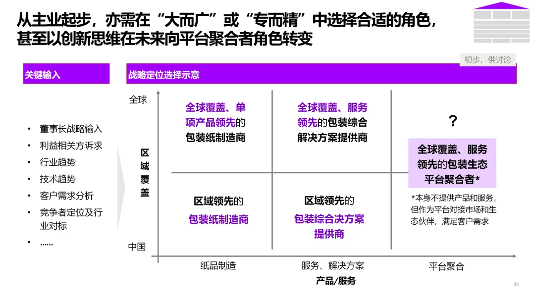 3. 客户直连与生态服务 | 从产品供应商转型为解决方案服务商。 | 1. 上线B2B数字门户,提供在线设计、虚拟打样、一键下单服务。2. 基于物联网,为高端客户提供纸张性能监测、库存管理等增值服务。3. 构建开发者平台,吸引包装设计、印刷企业共创解决方案。 |