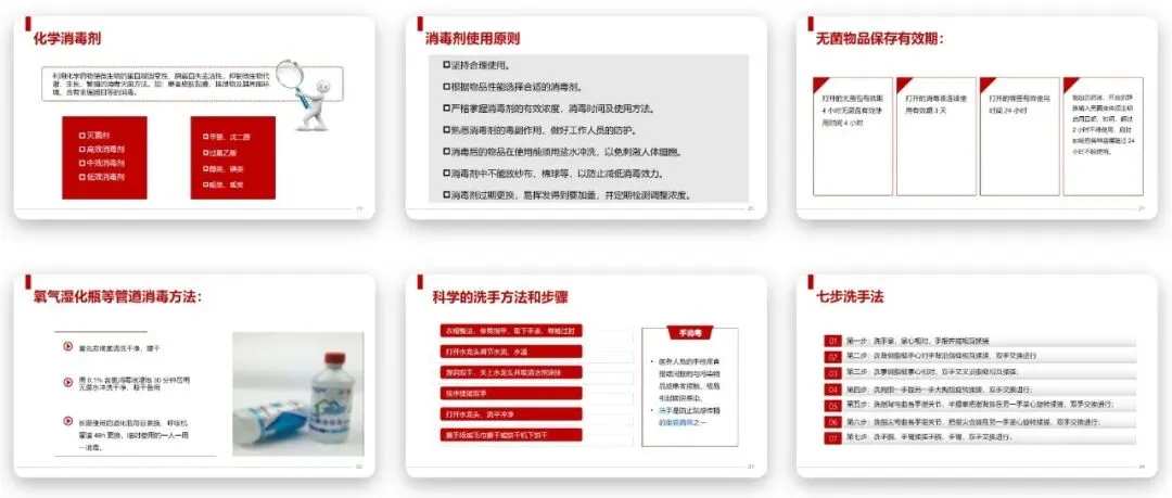 PPT围绕常态化防控的核心要求,搭建了循序渐进的内容体系,先梳理了院感的基础常识,巩固全员的基础认知,再详细拆解了日常工作中的各项防控规范与操作要求。