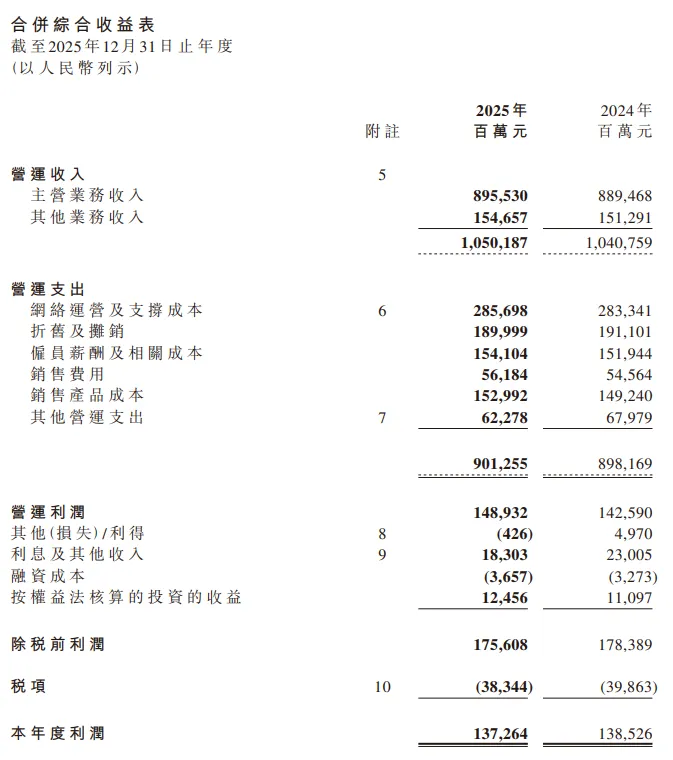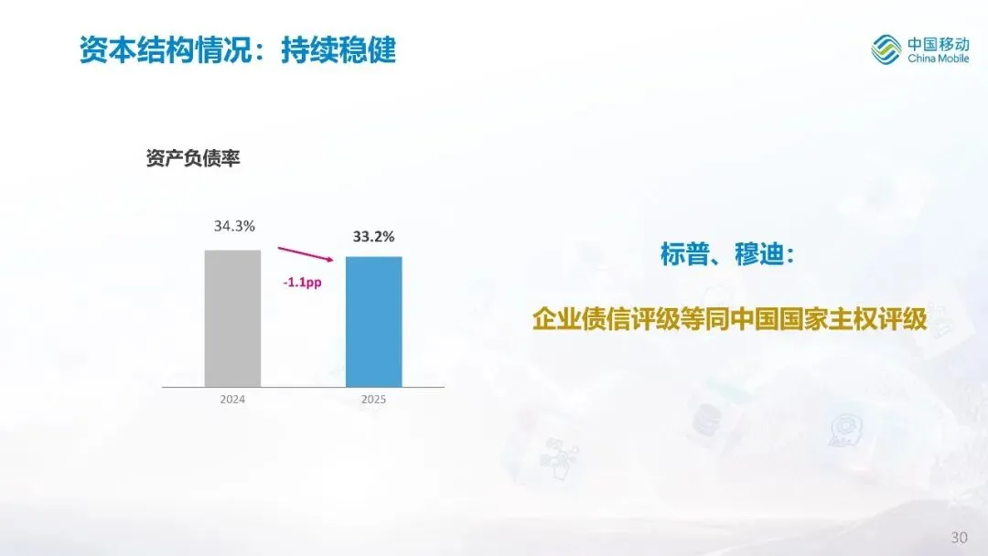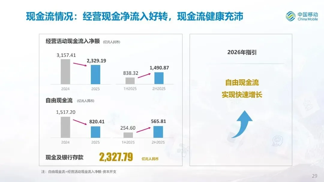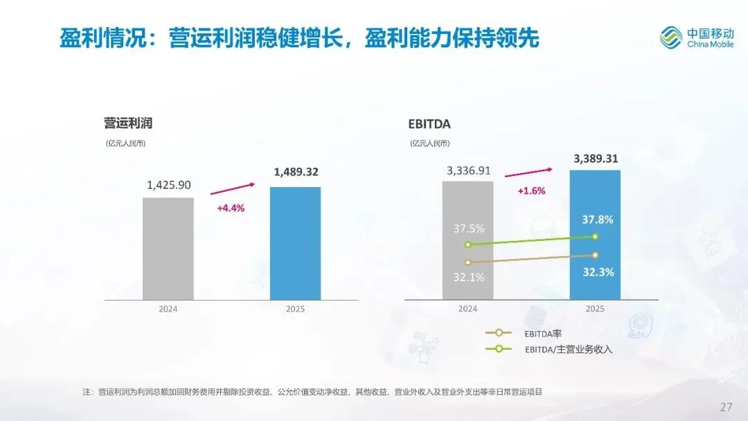 2025年公司营运利润达到1489亿元,同比增长4.4%。股东应占利润为1371亿元,同比下降0.9%,同口径同比增长2.0%,每股盈利为6.35元;EBITDA为3389亿元,同比增长1.6%,EBITDA率为32.3%,同比提升0.2个百分点。资本开支为1509亿元,同比下降8.0%。自由现金流为820亿元,保持健康充沛。