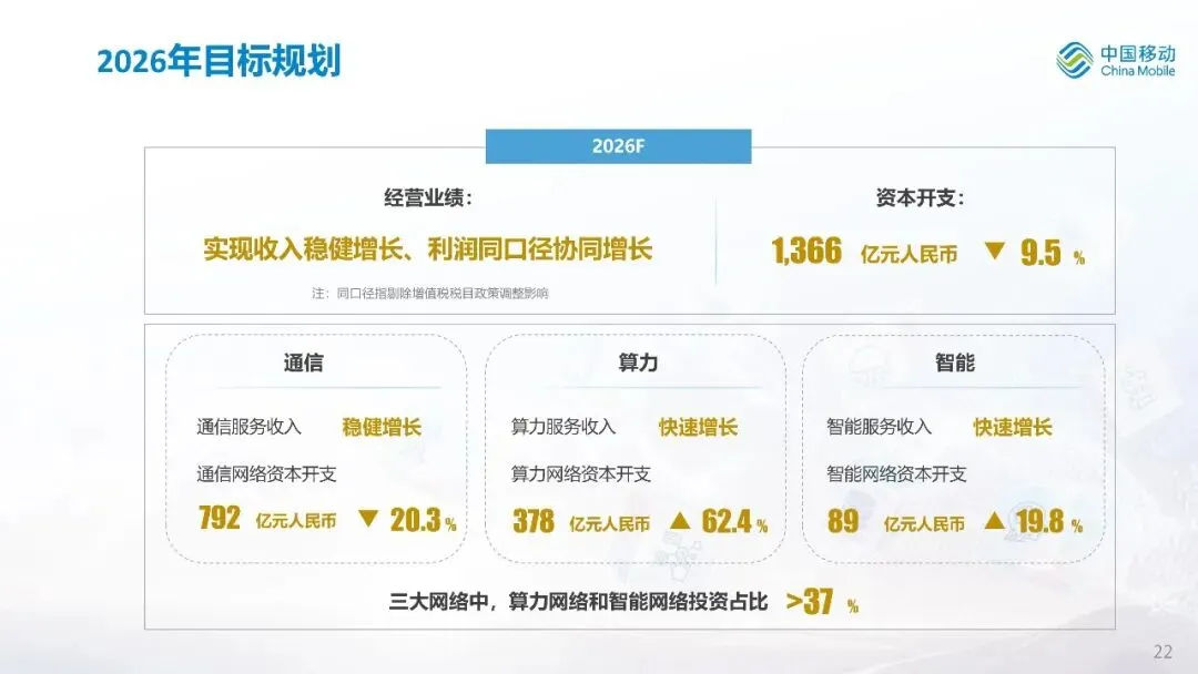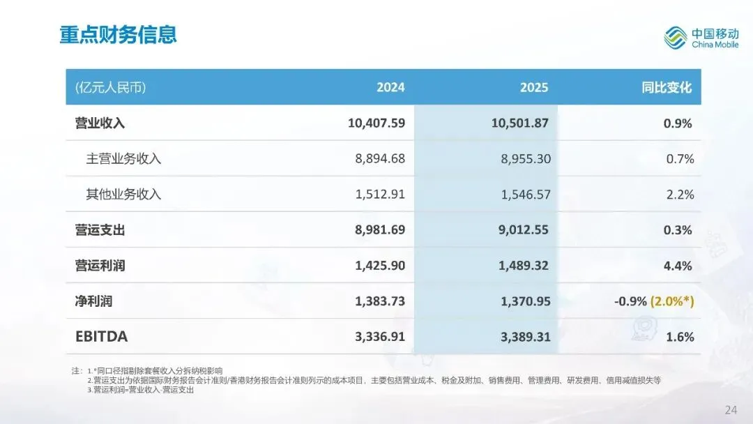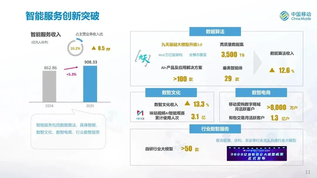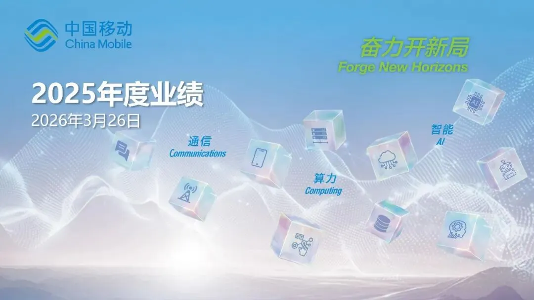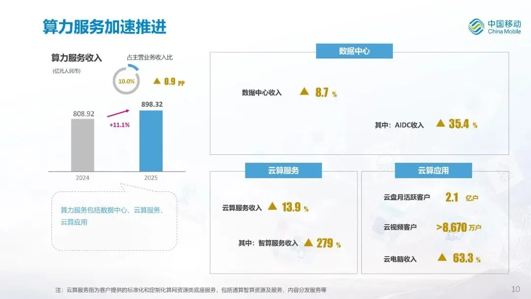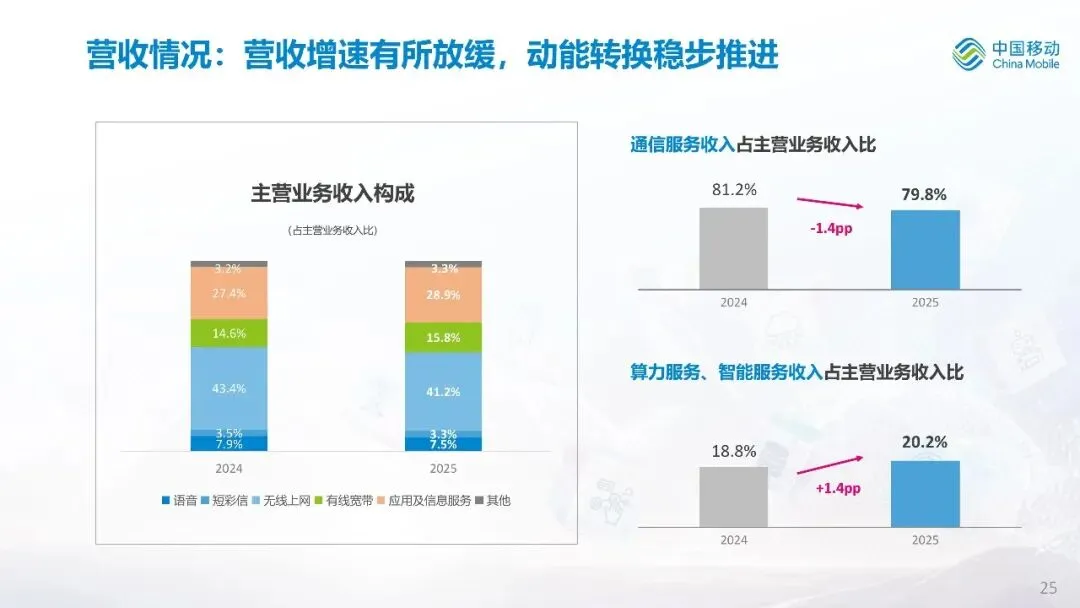 2025年,中国移动营运收入达到10502亿元,同比增长0.9%;主营业务收入达到8955亿元,同比增长0.7%。通信服务收入占主营业务收入比为79.8%;算力服务、智能服务收入占主营业务收入比为20.2%,同比提升1.4个百分点。