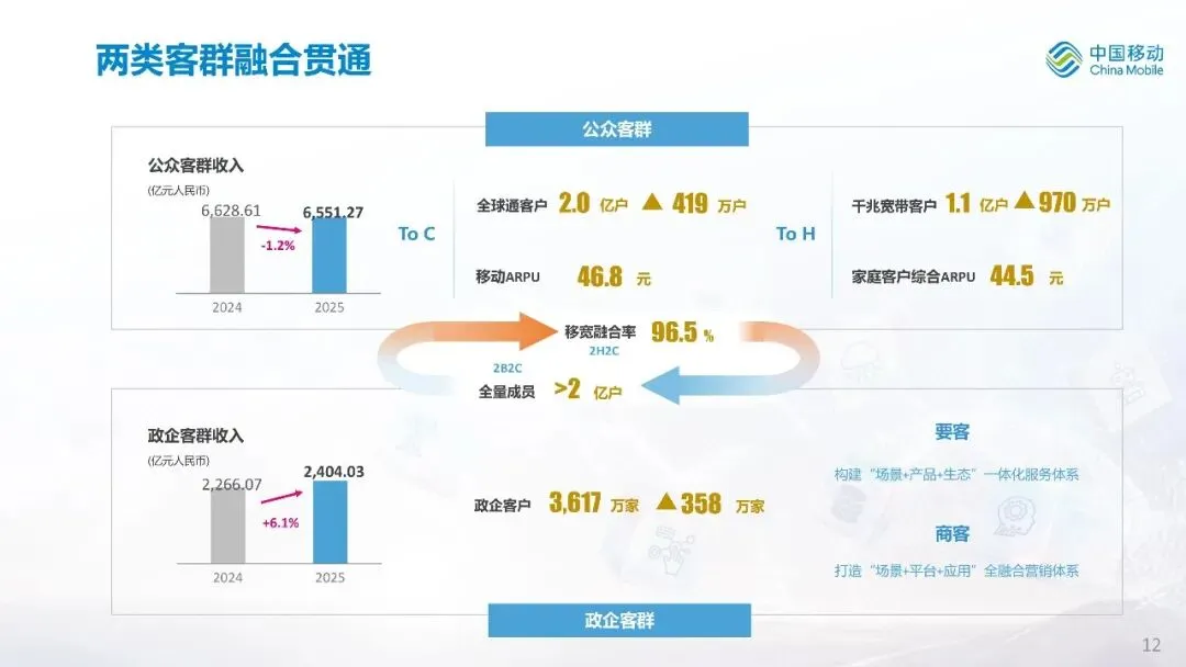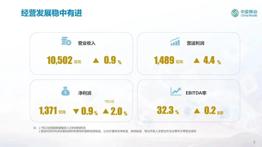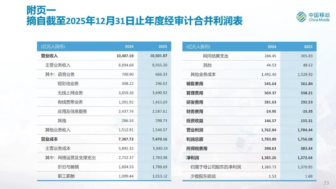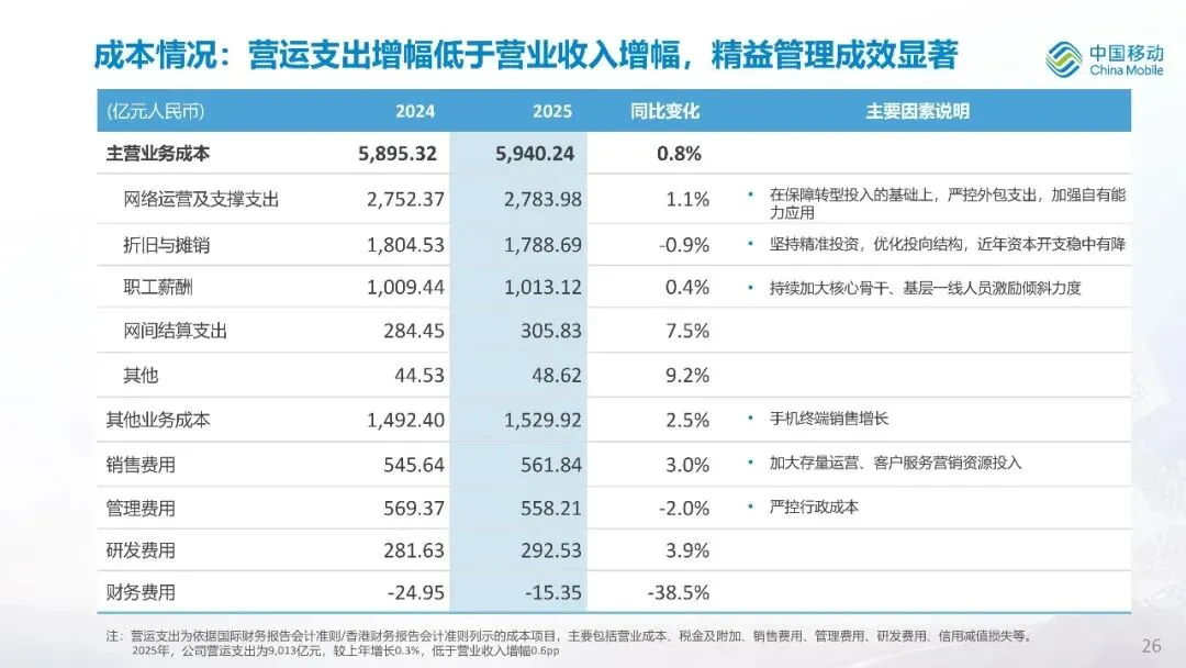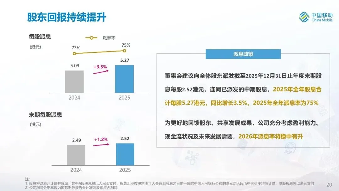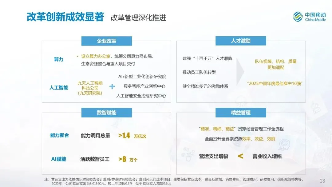 2025年,中国移动营运收入达到10502亿元,同比增长0.9%;主营业务收入达到8955亿元,同比增长0.7%。通信服务收入占主营业务收入比为79.8%;算力服务、智能服务收入占主营业务收入比为20.2%,同比提升1.4个百分点。