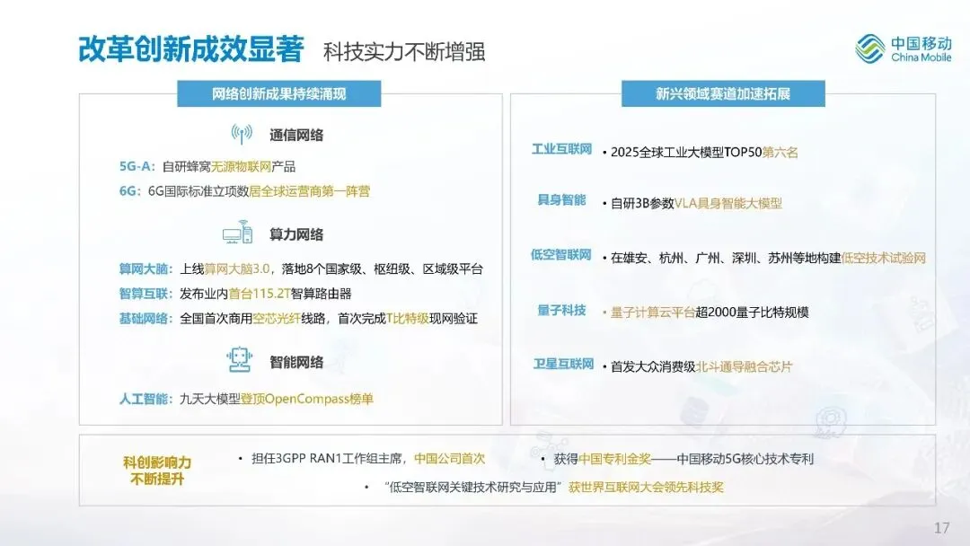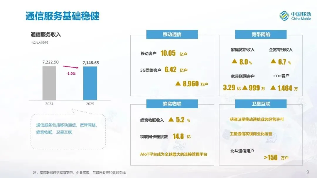 通信服务收入7149亿元,同比下降1.0%。移动客户规模达到10.05亿户;5G网络客户达到6.42亿户,净增8960万户,渗透率达到63.9%。宽带联网客户达到3.29亿,净增999万,宽带网络收入同比增长7.1%。物联网卡连接数达到14.8亿,AIoT平台成为全球最大的连接管理平台。公司获颁卫星移动通信业务经营许可,卫星通信迈入商业化运营阶段。