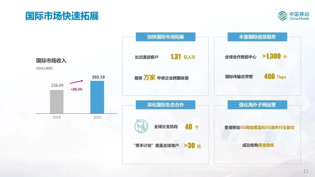 国际市场收入293亿元,同比增长28.5%。公司持续增强国内国际“两个市场”融通效应,推动优质产品、能力出海,支撑“一带一路”高质量共建。服务万家中资企业跨国发展,全球合作数据中心超1300个,“牵手计划”覆盖全球用户超30亿户,成功收购香港宽频,充分发挥协同效应,著力为香港消费者提供更丰富、更优质的通信和数字化服务。