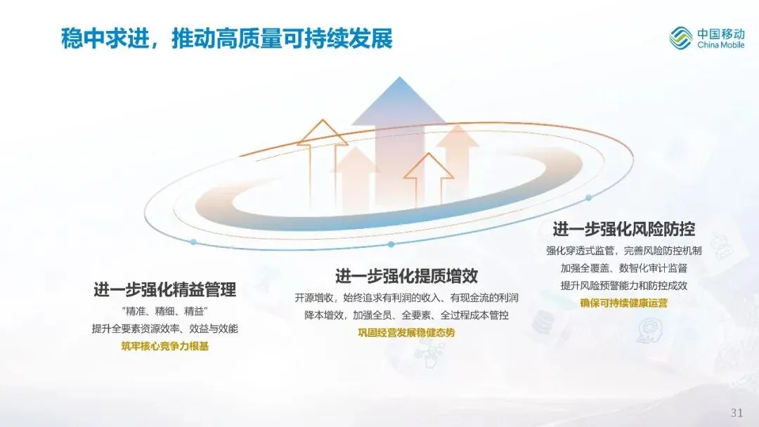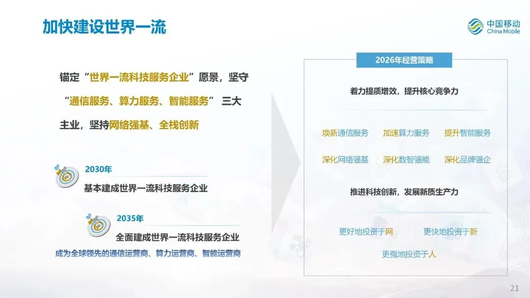 2026年是“十五五”规划的开局之年,中国移动将持续做强做优做大通信、算力、智能服务,推动实现质的有效提升和量的合理增长。一方面,著力提质增效,提升核心竞争力。焕新通信服务,加速算力服务,提升智能服务;深化网络强基,深化数智强能,深化品牌强企。另一方面,推进科技创新,发展新质生产力。坚持创新领先,提升投资效益,更好地投资于网;加快新兴产业佈局,更快地投资于新;全面推进人才发展,更强地投资于人。公司将努力实现收入稳健增长、利润同口径协同增长,向“世界一流科技服务企业”迈出坚实步伐,持续为广大股东、客户创造更大价值。
