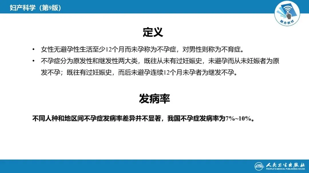 不孕症是指夫妻正常性生活、未避孕满 1 年未怀孕,我国发病率约 7%—10%,分为原发性和继发性两类。不孕原因中,女方占主要部分,常见的有输卵管堵塞、盆腔粘连、子宫病变、排卵异常等;男方多为精液质量差、性功能异常;还有约 10%—20% 原因不明。