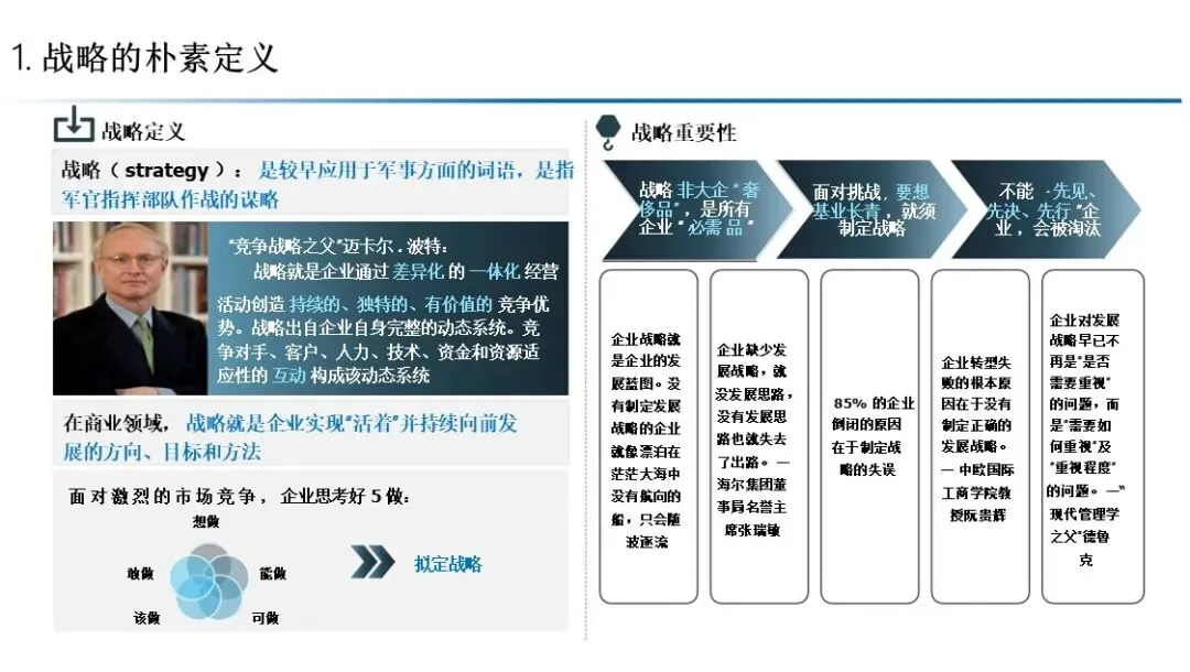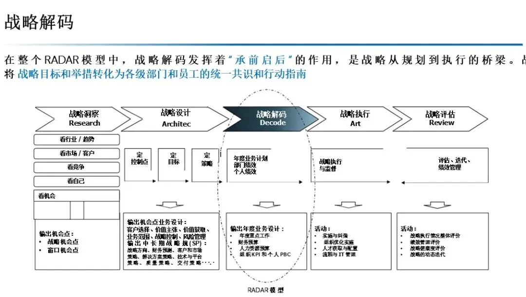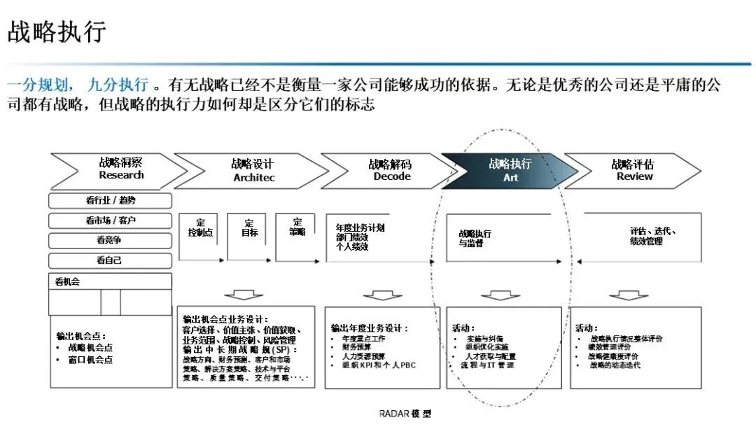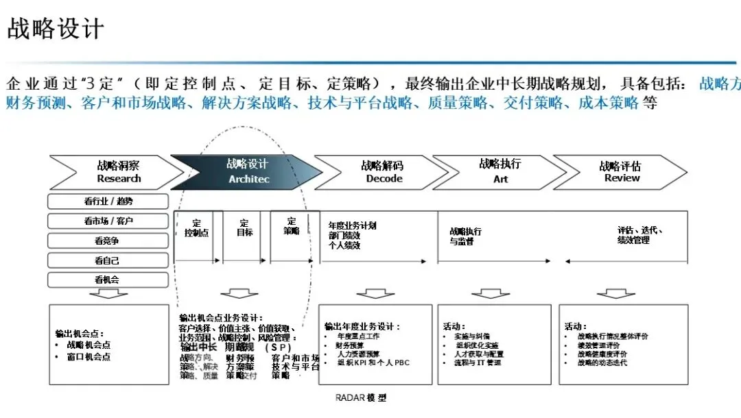 本方案以 RADAR 模型为核心,构建了从战略洞察到战略评估的完整闭环。通过 五看三定 锁定机会,通过 OGSM 与 BEM 实现战略解码,通过 经营分析会 与 滚动预测 保障执行,通过 复盘与自我批判 推动持续迭代。最终通过 组织、人才、文化、变革 四大保障,将战略转化为企业的核心竞争力。