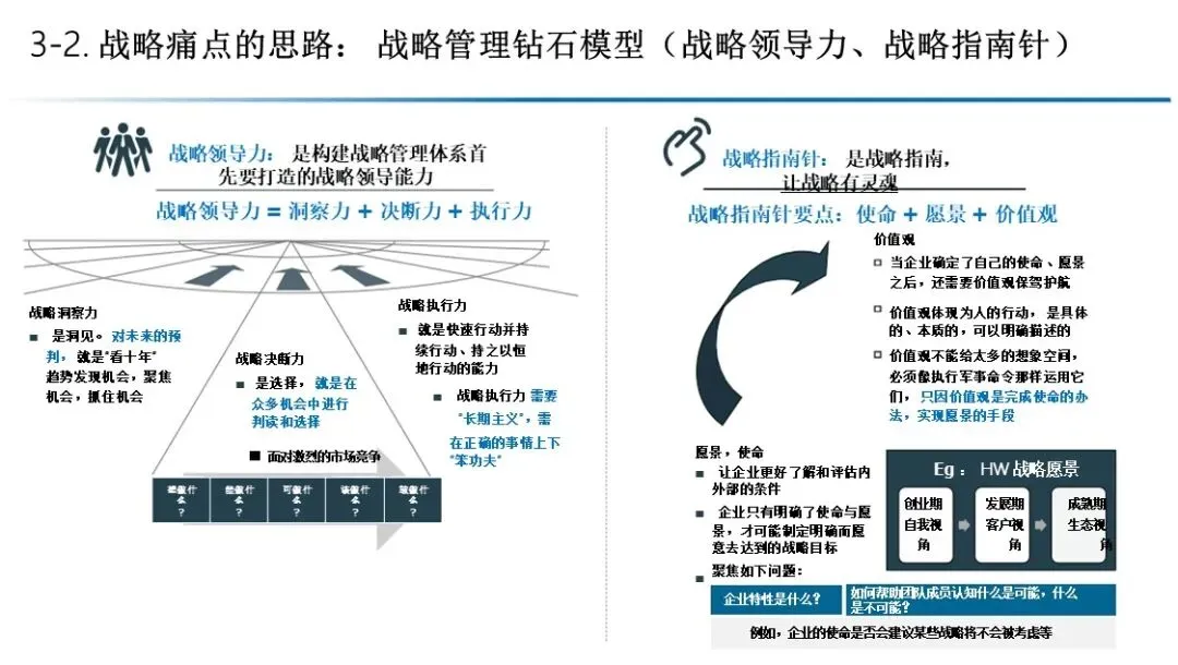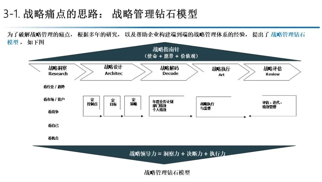 该模型强调战略领导力(洞察力+决断力+执行力)为驱动,使命、愿景、价值观为指南针。