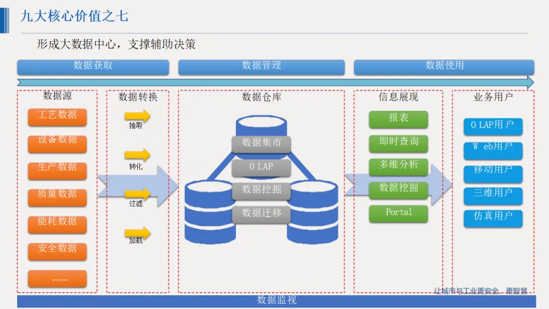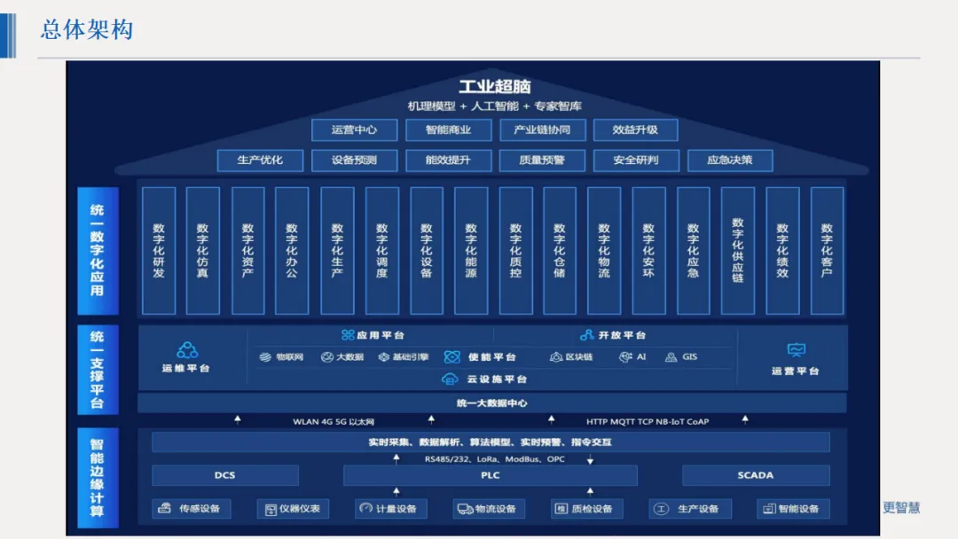 方案采用“工业超脑+统一支撑平台+数字化应用”的总体架构,以机理模型、人工智能与专家智库为核心,通过物联网设备实时采集DCS、PLC等系统数据,依托统一大数据中心实现数据集成与流转,打造数字化生产、设备、能源、质控、安环等多元应用场景。核心聚焦九大核心价值,涵盖技术产品业务深度融合、集中灵活生产调度、全维度数据采集、质量事件追溯、设备故障诊断、能源优化、大数据辅助决策、重大危险源监测预警及安全风险研判。