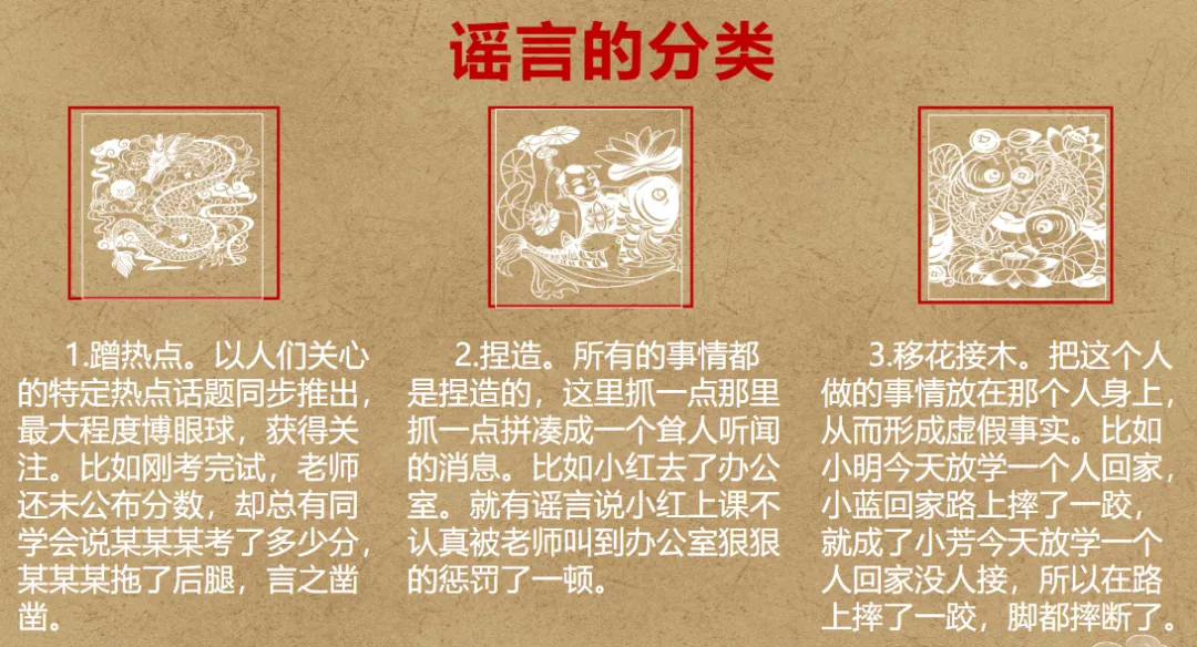 人们只听到只言片语,或者只看到事情的一角,就加上自己的猜测、夸张的描述,把不是事实的内容讲出来,这就成了谣言。