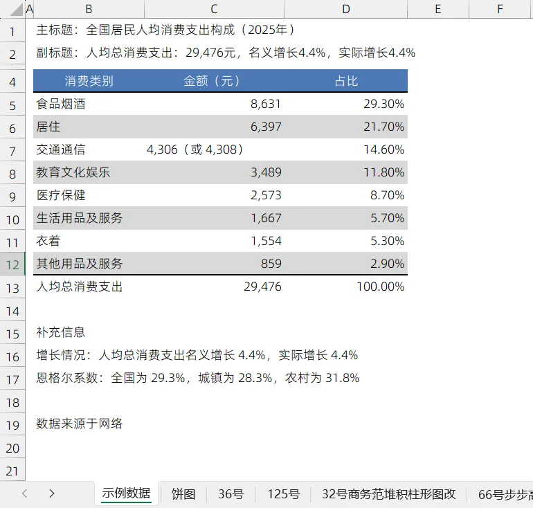 为网上查找到的2025年全国居民人均消费支出构成数据。注意数据的排序,是根据金额从大到小的哈(这点很重要,数据排序,直接影响了图表中各类别的展示顺序)。