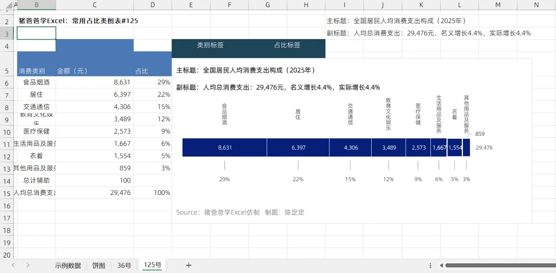 占比堆积条形图(类别过多?饼图不简洁美观?就用条形图)|猪爸爸学Excel