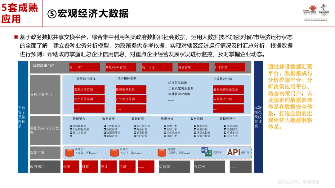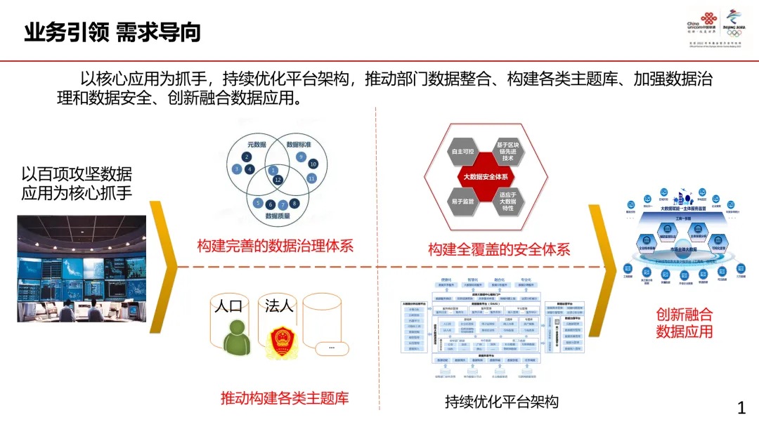核心内容:建立高标准数据资源标准体系,推动人口、法人等主题库构建,持续优化平台架构,以百项攻坚数据应用为核心抓手,创新融合数据应用。