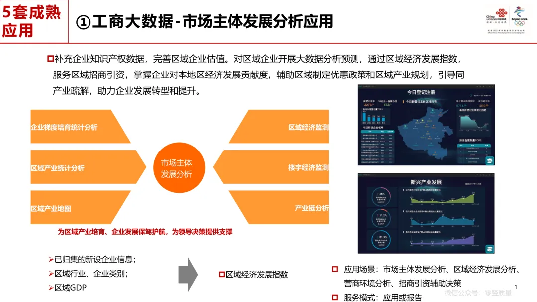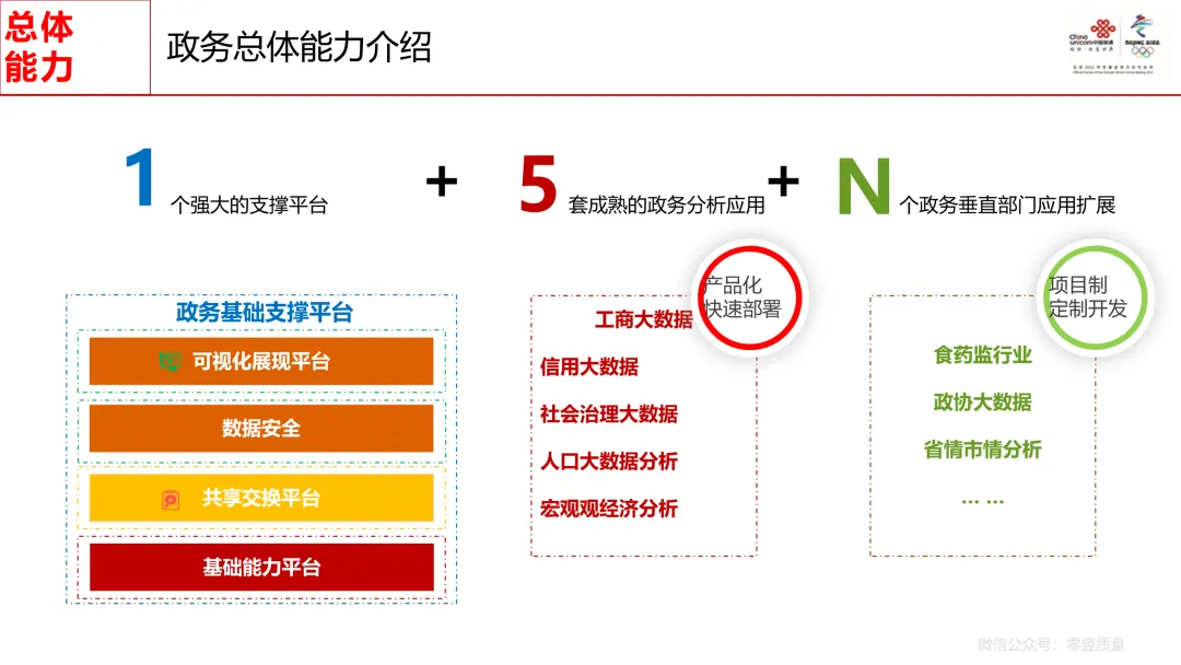 核心能力:以 1 个政务基础支撑平台为核心,配套 5 套成熟应用(工商、信用、社会治理、人口、宏观经济大数据),可扩展 N 个政务垂直部门定制化应用。
