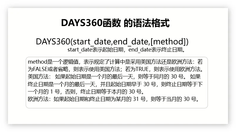 哈喽~大家好!今天要跟小伙伴们分享的是DAYS360函数,这个函数一般很少人会使用到,但是一旦用起来真的是yyds,在学习DAYS360函数之前,我们一起来学习一下这个函数的于语法结构吧,如下图示: