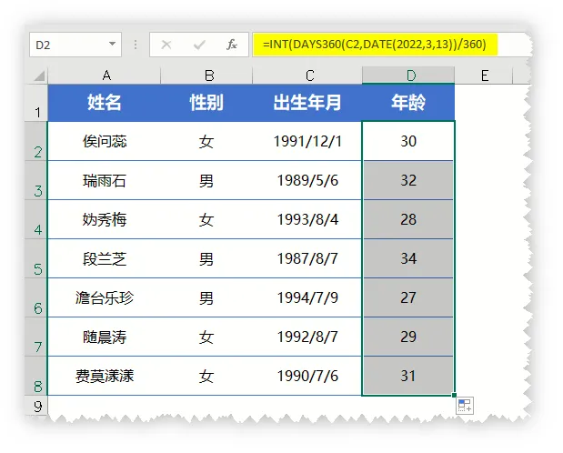 已知出生年月日信息,我们可以使用公式计算出年龄是多少岁,直接在下图案例的D2单元格中输入公式=INT(DAYS360(C2,DATE(2022,3,13))/360)下拉填充,公式的意思是通过DATE函数计算截止时间为2022/3/13;根据出生年月数据使用DAYS360函数计算差值后除以360,最后再使用INT函数取整得出的结果就是年龄。