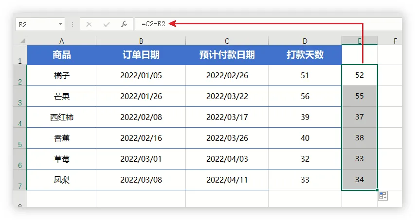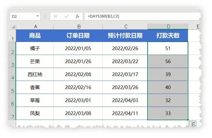 知道产品的订单日期和预计付款日期,我们可以使用DAYS360函数计算需要多少天会进行打款,可以直接在D2单元格中输入公式=DAYS360(B2,C2)