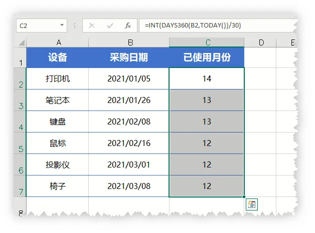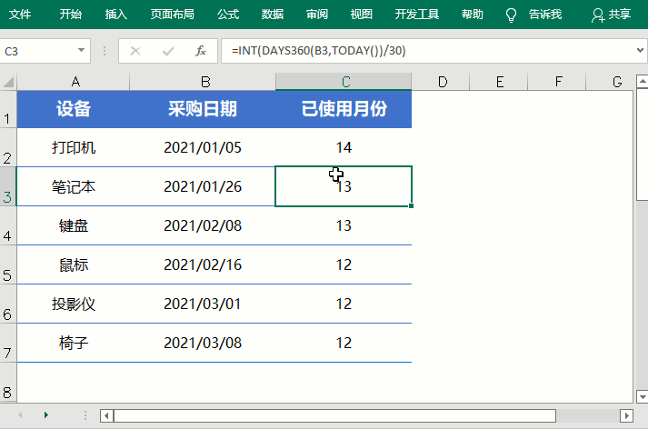 前面我们通过DAYS360函数学会计算年龄,打款天数;接着我们来学习一下根据采购日期计算设备已使用月份,如下图。在C2单元格输入公式=INT(DAYS360(B2,TODAY())/30)回车后下拉公式填充至下方所有单元格即可计算出已使用月份。