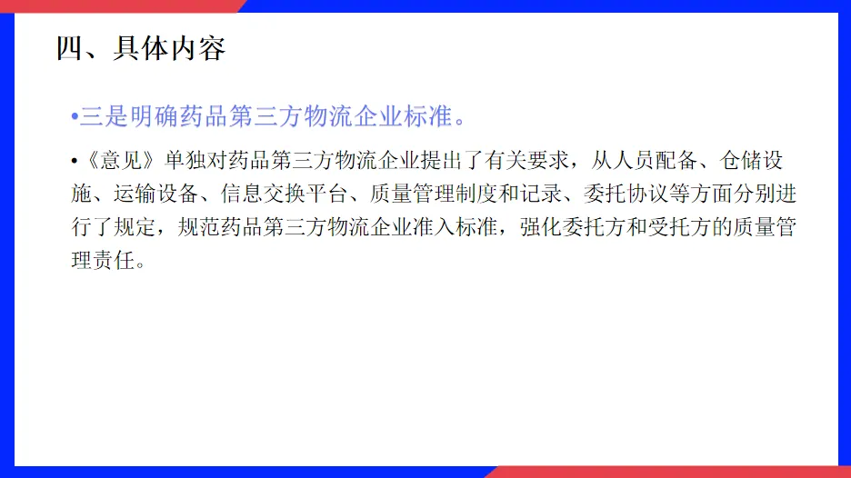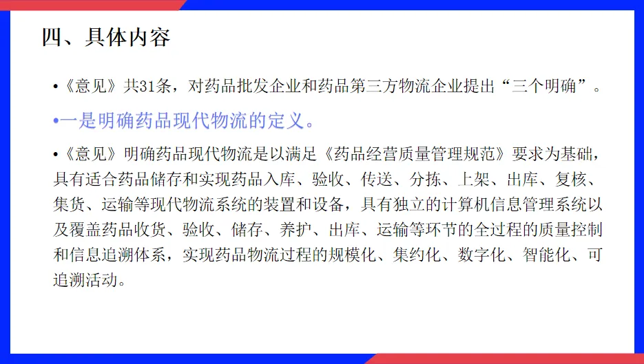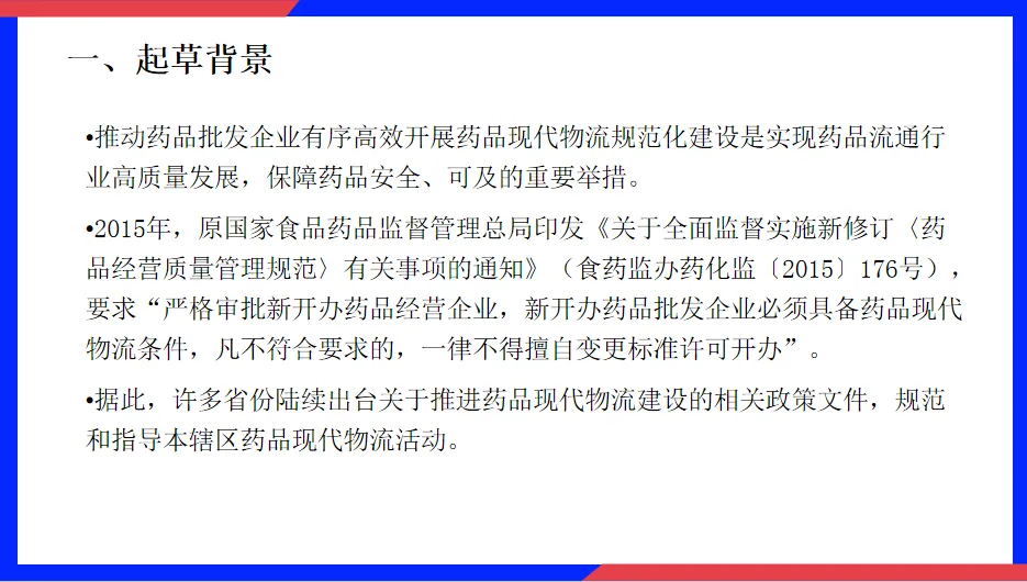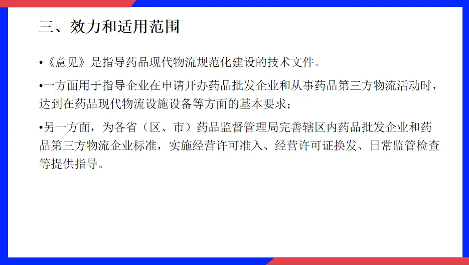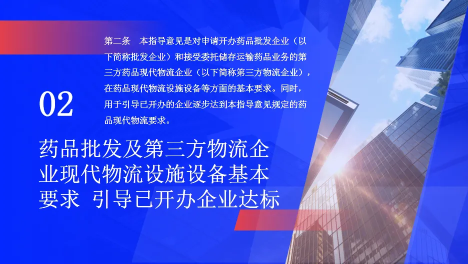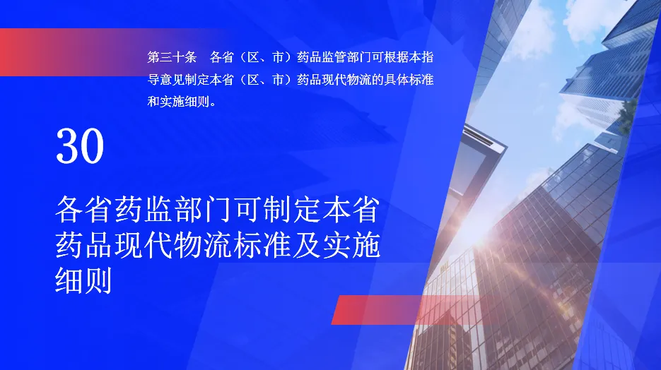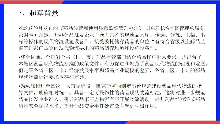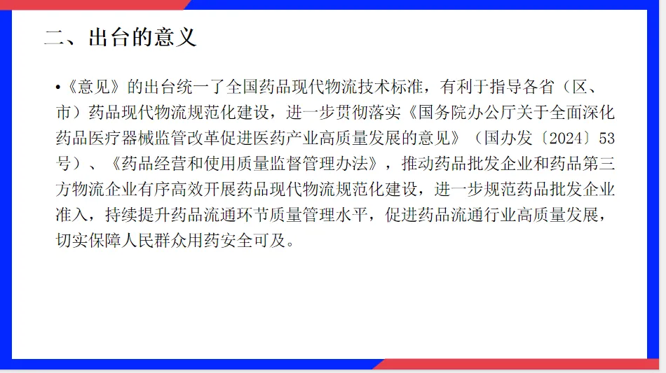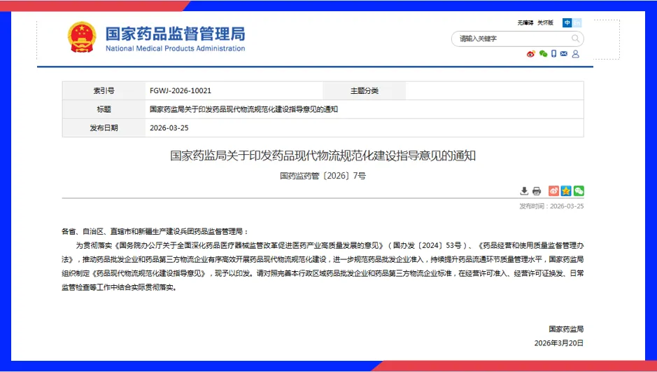 为贯彻落实《国务院办公厅关于全面深化药品医疗器械监管改革促进医药产业高质量发展的意见》(国办发〔2024〕53号)、《药品经营和使用质量监督管理办法》,推动药品批发企业和药品第三方物流企业有序高效开展药品现代物流规范化建设,进一步规范药品批发企业准入,持续提升药品流通环节质量管理水平,国家药监局组织制定《药品现代物流规范化建设指导意见》,现予以印发。请对照完善本行政区域药品批发企业和药品第三方物流企业标准,在经营许可准入、经营许可证换发、日常监管检查等工作中结合实际贯彻落实。