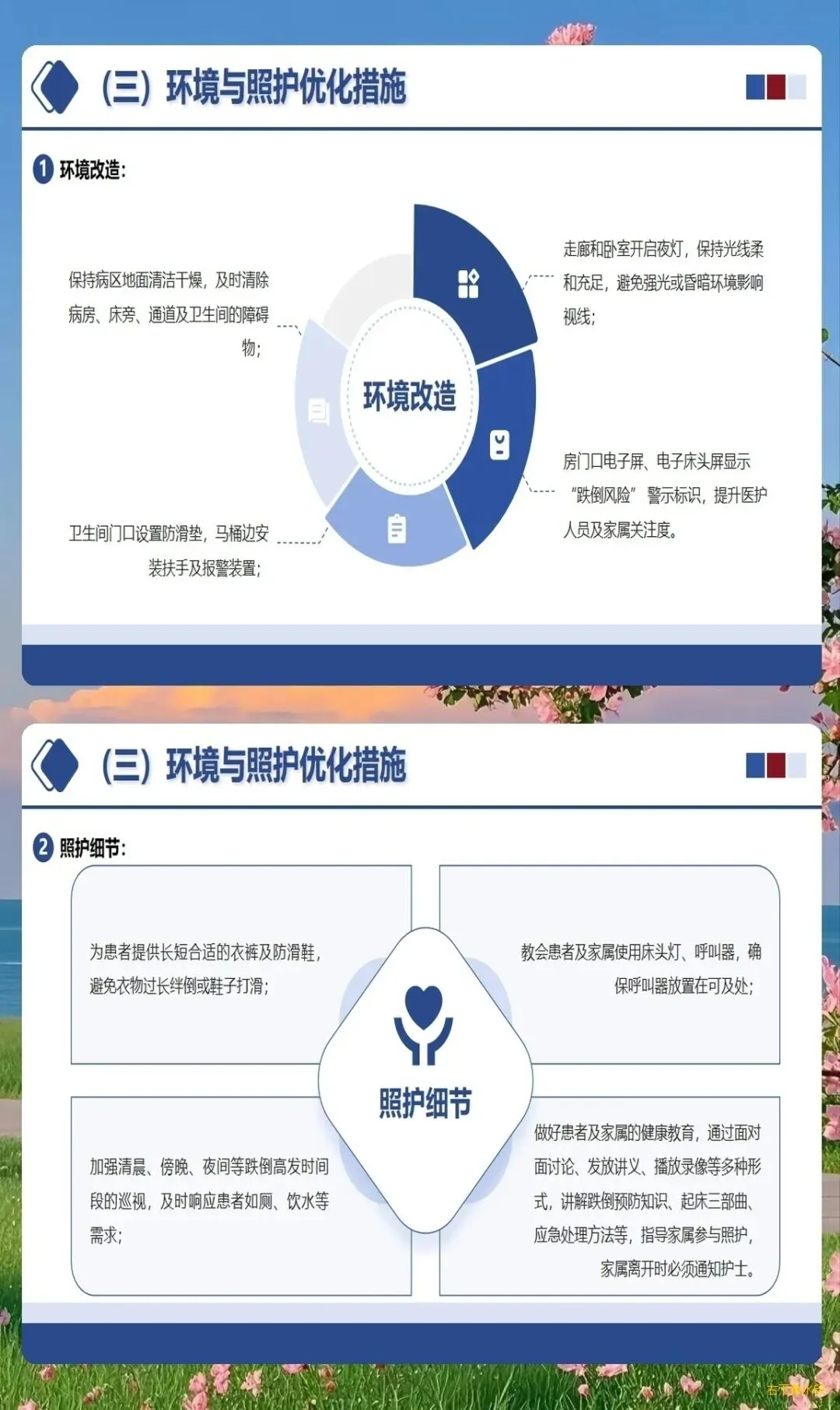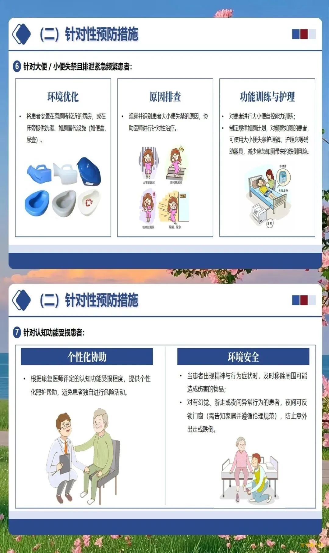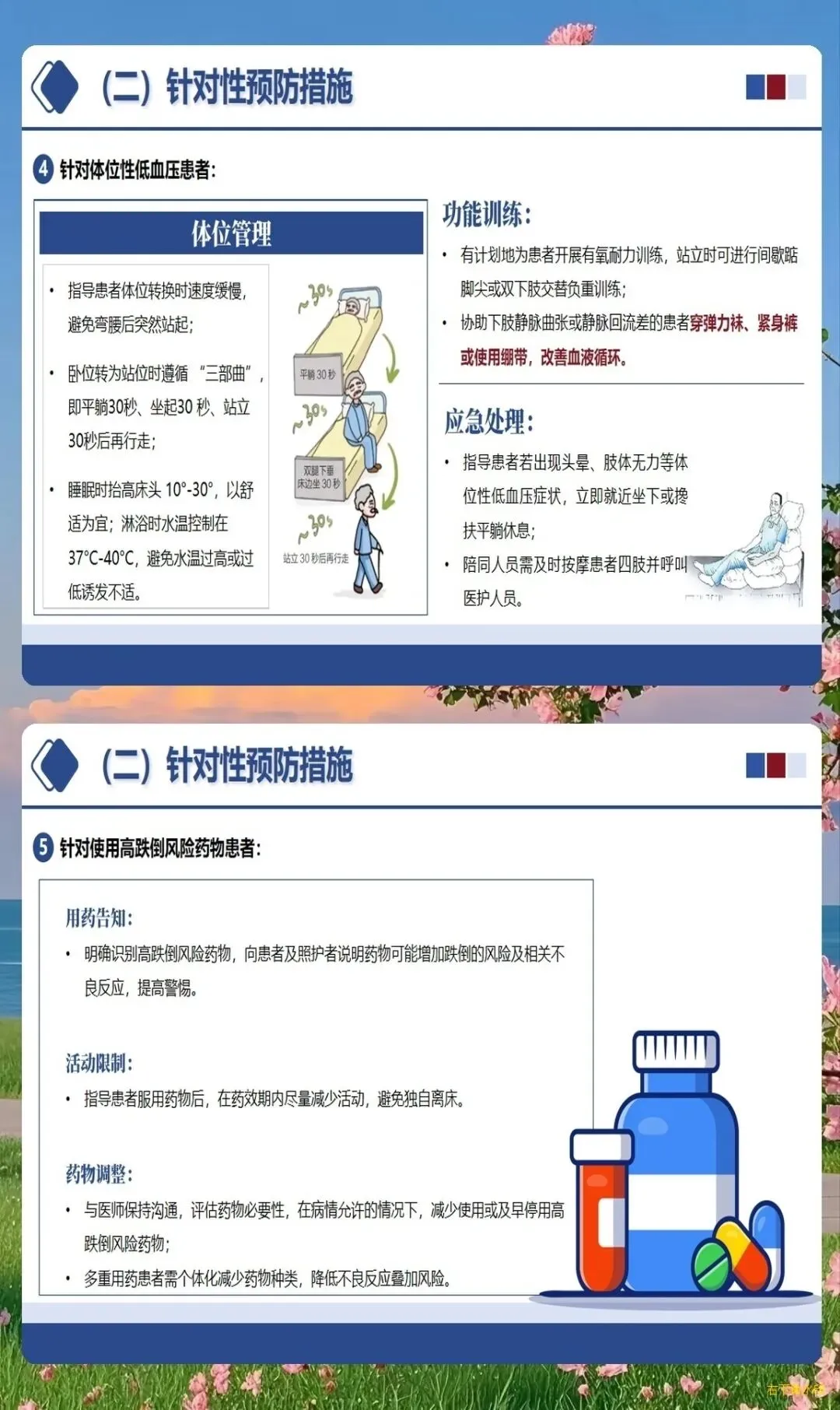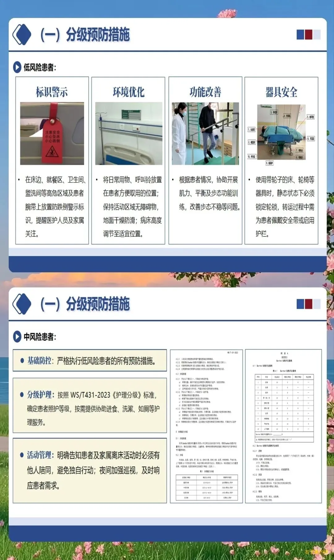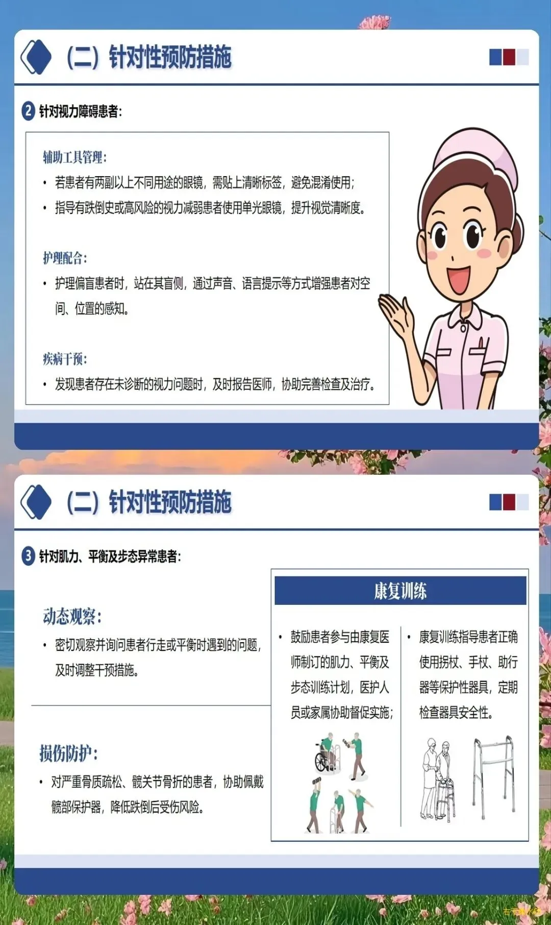 不同患者的跌倒风险因素各不相同,因此护理干预必须体现个体化原则。对于老年认知功能下降的患者,重点是加强看护,必要时使用保护性约束,同时与家属充分沟通,取得理解配合;对于肢体功能障碍的患者,应及早开展康复训练,提高行动能力;对于服用影响意识和平衡功能药物的患者,需密切观察药物不良反应,调整给药时间,避免在患者活动高峰期使用镇静类药物。
