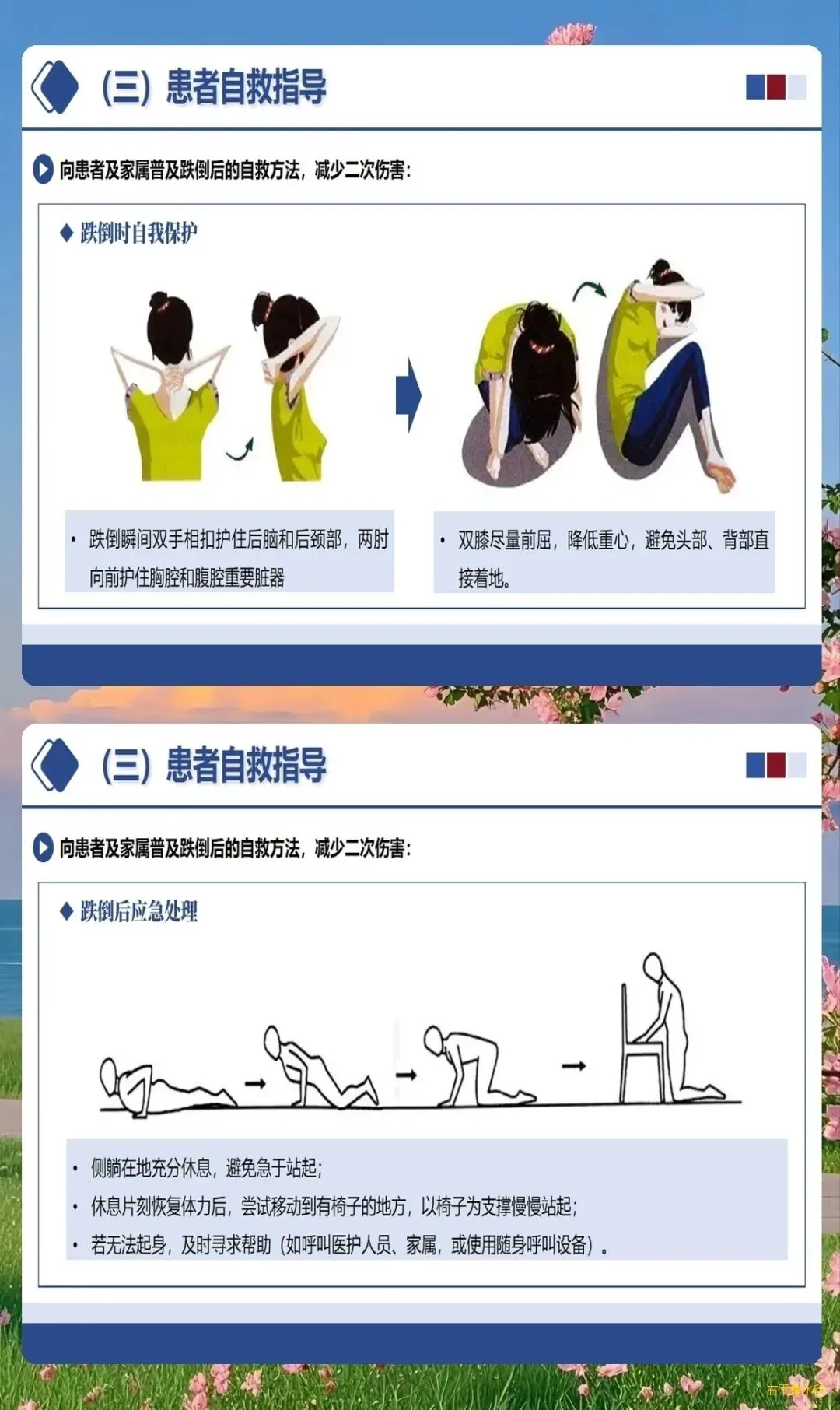 在护理过程中,健康教育的重要性不容忽视。许多患者对自身跌倒风险认识不足,过分高估自己的行动能力。护理人员需要通过通俗易懂的语言,向患者及家属讲解跌倒的危害、预防措施和应急处理方法。特别要强调"三个半分钟"原则:醒来躺半分钟、坐起半分钟、双腿下垂半分钟,避免体位性低血压导致的跌倒。