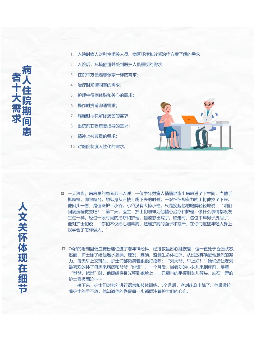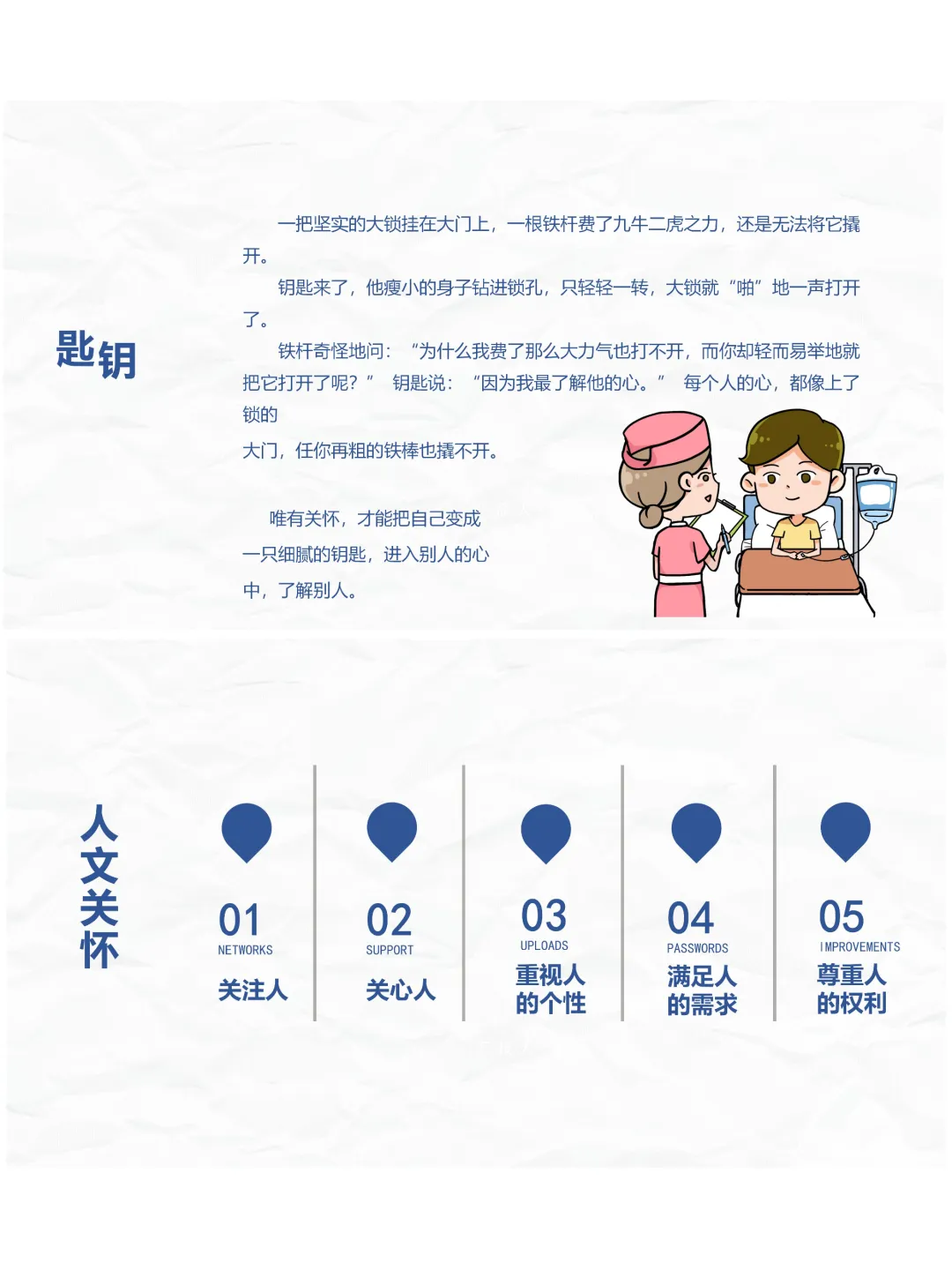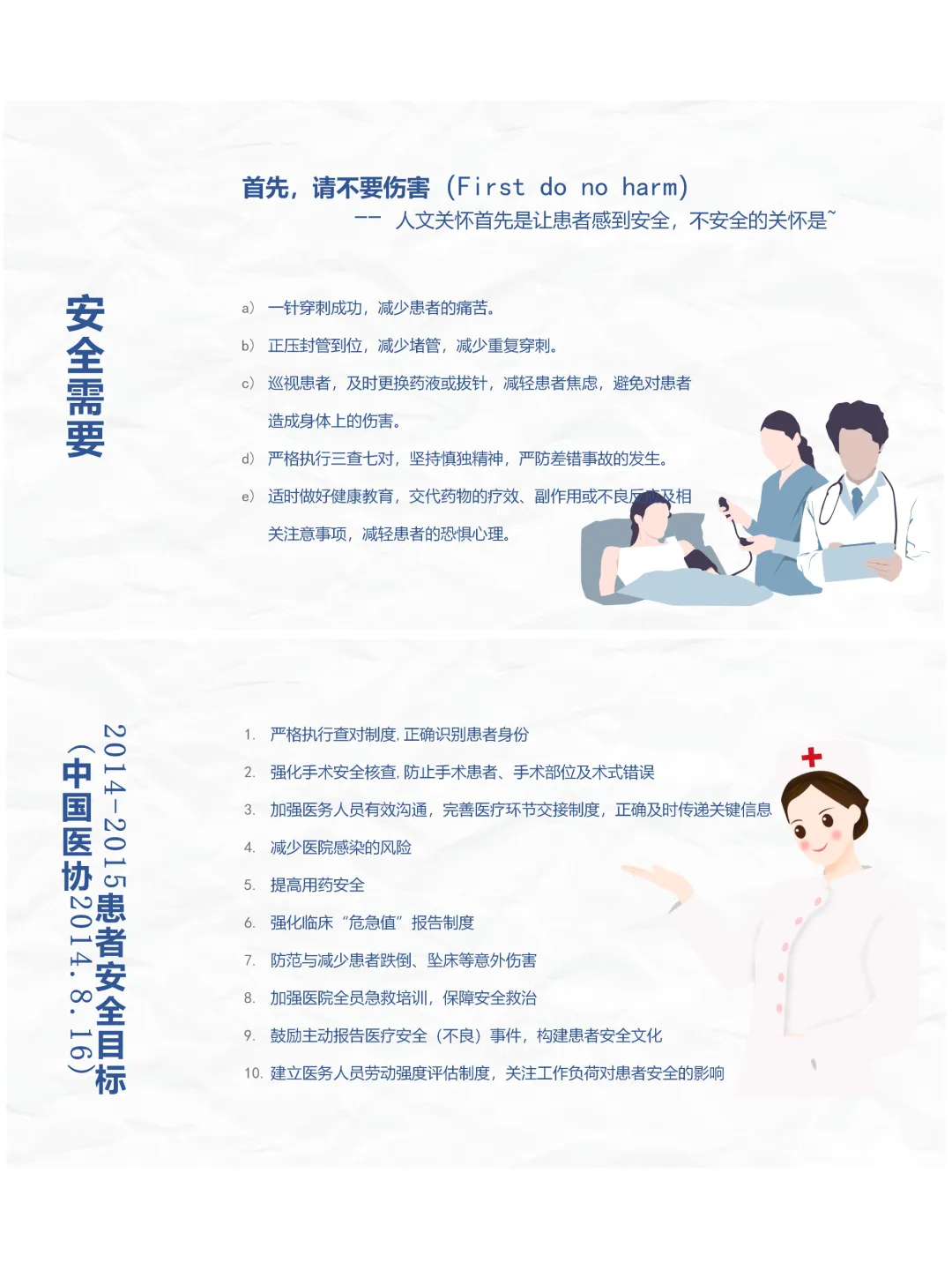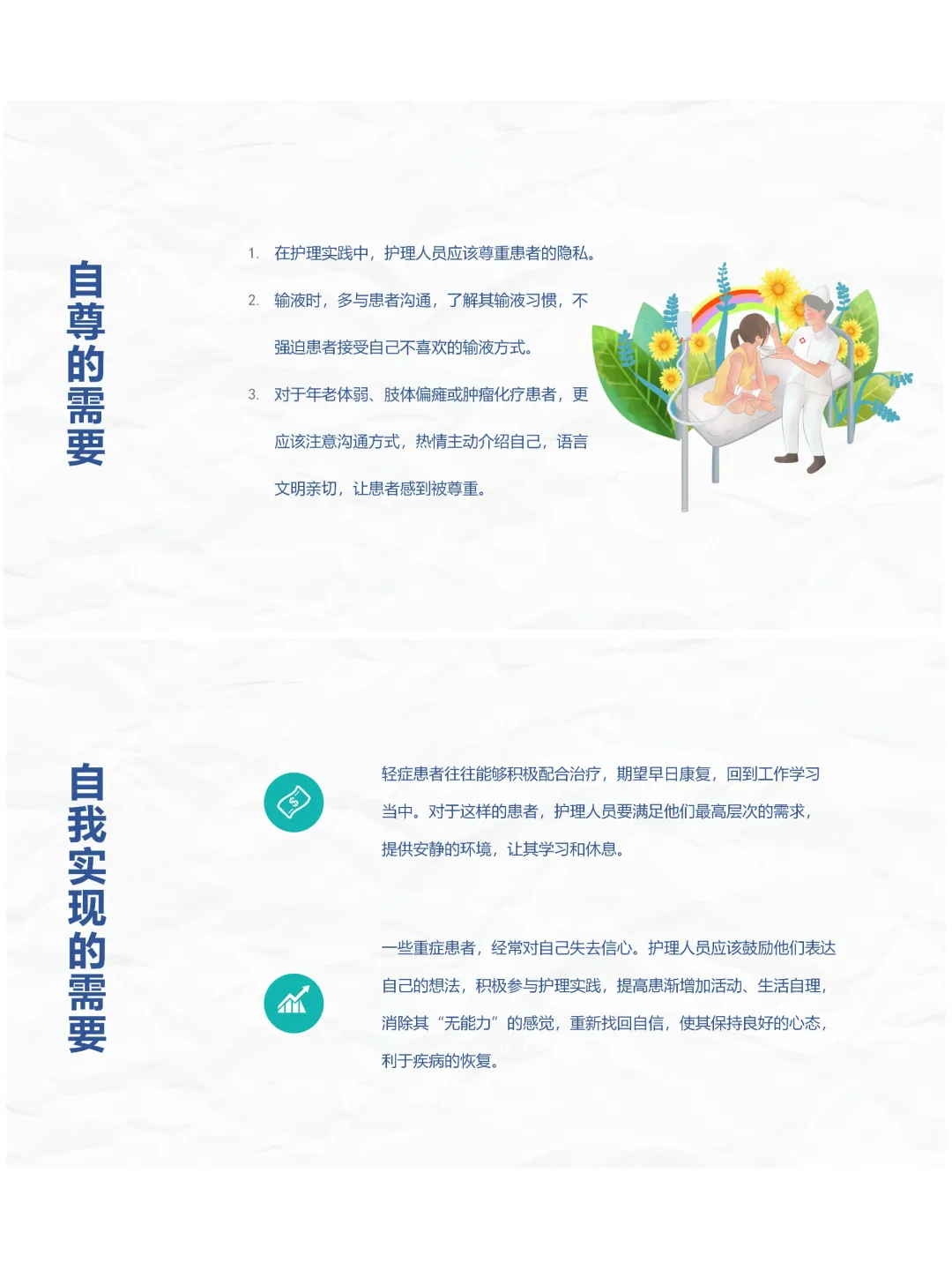 再往上,患者需要爱与归属,尤其是无家属陪伴的老人、重症患者,咱们多一句问候、多一点陪伴,换位思考理解他们的痛苦,就能让他们感受到温暖。自尊的需要也很重要,输液时尊重患者的习惯、保护患者的隐私,对肿瘤、偏瘫患者多一点耐心,让他们感受到被尊重,而不是被忽视。对于能自理的轻症患者,咱们创造安静的环境,支持他们的自我实现,助力他们早日回归生活。、