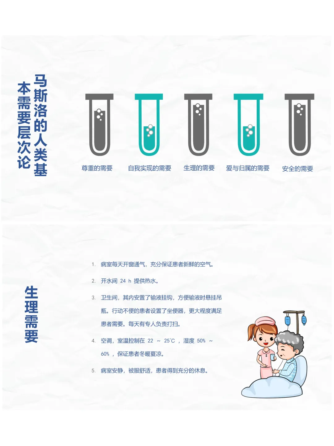 人文关怀的核心就五点:关注人、关心人、重视个性、满足需求、尊重权利,这和马斯洛的需要层次论高度契合,从生理、安全,到爱与归属、自尊、自我实现,咱们的护理要层层满足患者的需求。先说说最基础的生理需要,病室通风、24 小时热水、舒适的温湿度,这些细节能让患者住得安心;而安全需要是基础中的基础,一针穿刺成功、正压封管到位、严格三查七对,不让患者受二次伤害,这是咱们的基本要求。