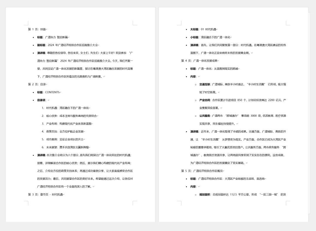 我们可以通过豆包AI帮助对文案进行分页,然后复制到PPT当中,这样就可以得到PPT初稿。文字内容梳理完后,那么接下来就可以直接对页面进行优化了。广清经济特别合作区招商推介大会的封面,主标题“广清协力 智启新篇”直接点明了会议的核心目的,背景选用广清的城市地标。