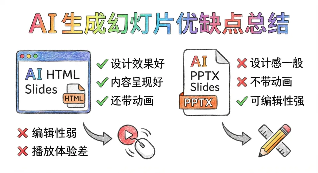 - 用 AI 生成的 HTML 格式幻灯片 (a) 设计效果好,内容呈现好,还带动画 (b) 缺点是可编辑性很弱,播放起来的体验很差