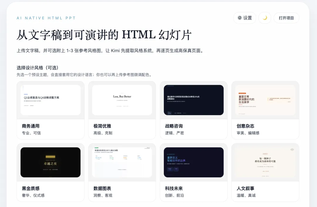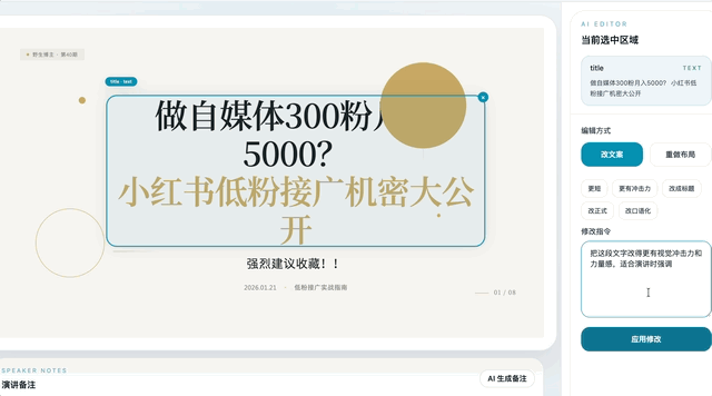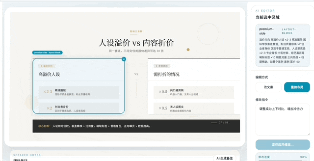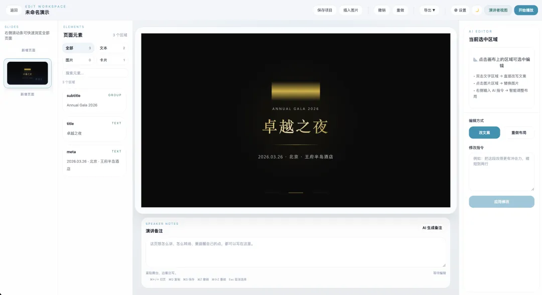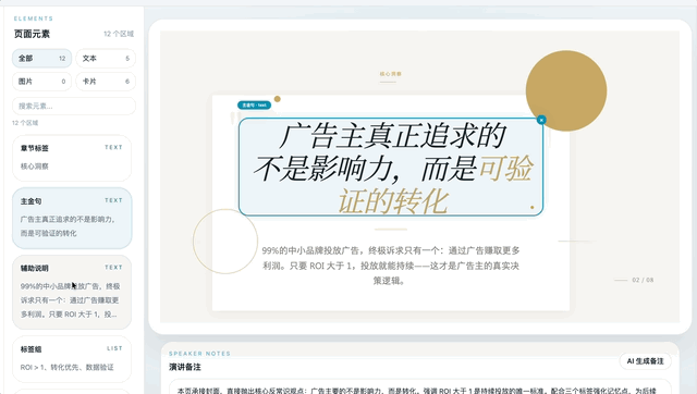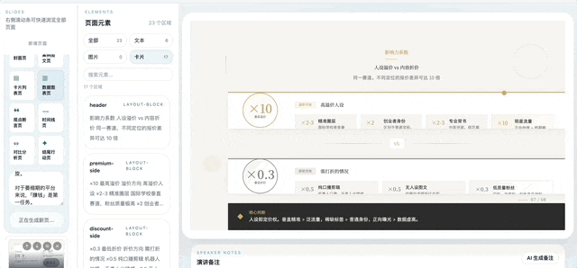 如果只是用 AI 出一些 PPT 的工具,只是导出个 PPTX 的一个格式,你会发现它在动态效果上,跟整个的设计呈现上都很难算得上是优雅。