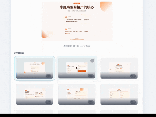 大概1-2分钟时间,Ai就会基于你的文案和选中的内容类型,生成一个新的页面。