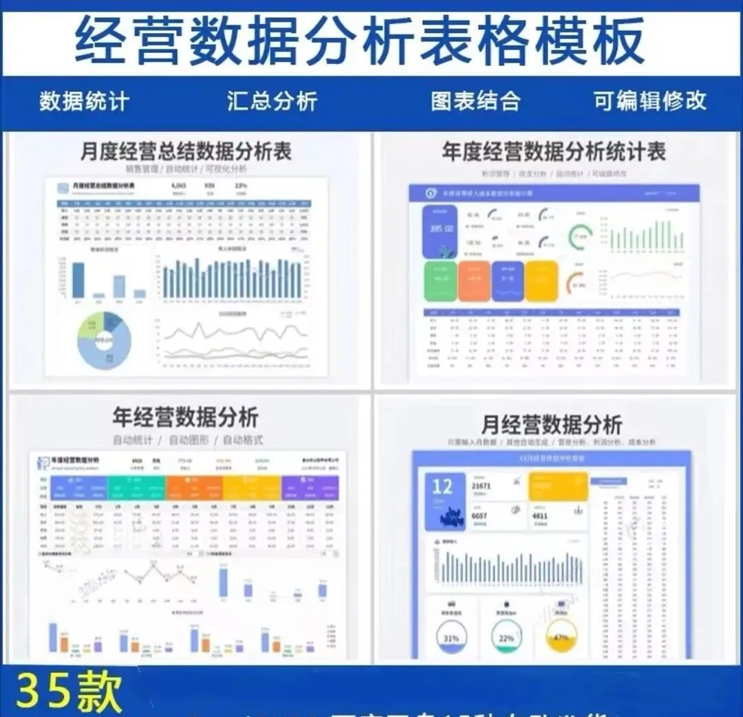 今天给大家整理了一套35款财务经营数据统计分析表Excel模板,包含月度/年度经营分析、财务报表可视化看板、成本利润分析等,全部支持Excel/WPS编辑,数据自动更新,拿来就能用。