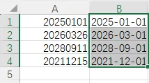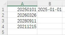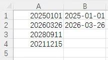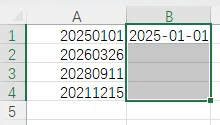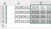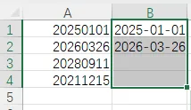 你用 Ctrl+E 智能填充时,只保留了年月,把日期部分丢掉了,这是因为你手动输入的第一个示例(B1 单元格)是 2025-01-01,但 A1 是 20250101(8 位日期),而 A2 是 20260326(同样 8 位),Excel 智能填充会学习你的 “示例格式”: