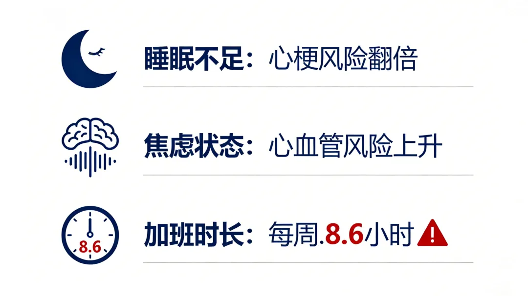 更危险的是,职场人的熬夜往往不是单纯的"晚睡",而是高度精神紧张+睡眠剥夺+久坐不动三重叠加。这种组合对心血管系统的伤害,远比你想象的更深。