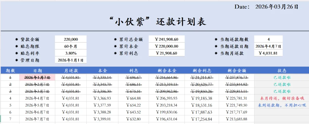 公式:=IF(B$4>A10, “已还款啦”, IF(B$4=A10, “本月待还,做好准备哦”, “未到还款期,不用担心呢”))